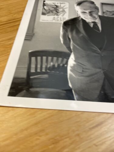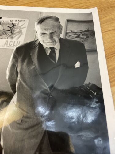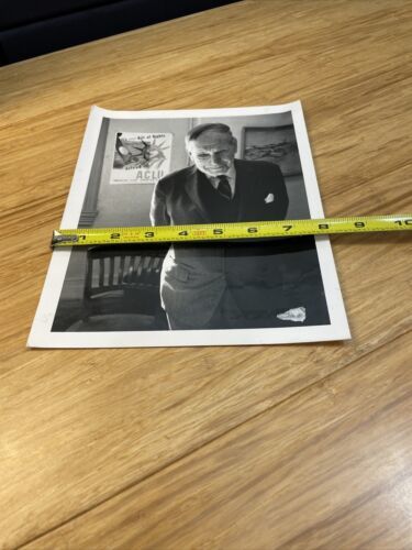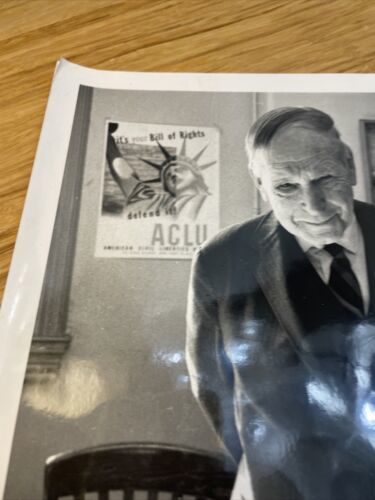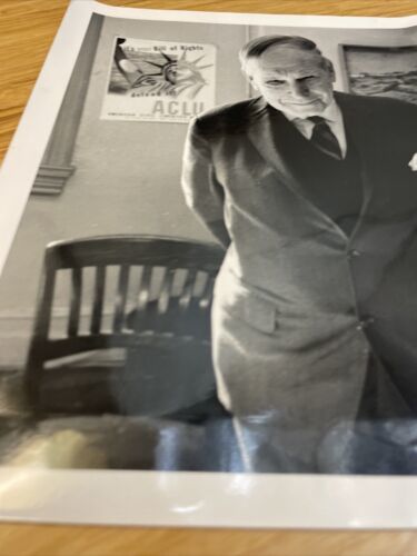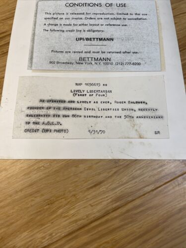 Beautiful 8X10 black and white photograph of ACLU Founder and Author Roger Baldwin. This was taken in 1970, as he celebrated his 86th birthday and his 50th anniversary of the ACLU. Photo was not stored properly, so it is yellowing, is crinkled, and is also showing wear and tear around the corners and edges. The back has a description of the photo and the conditions of use. Some paper has been stuck on one corner. Please see pictures for condition details and measurements on a great one of a kind item. Measures 8X10.