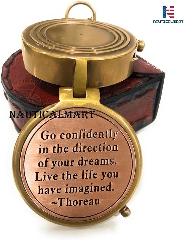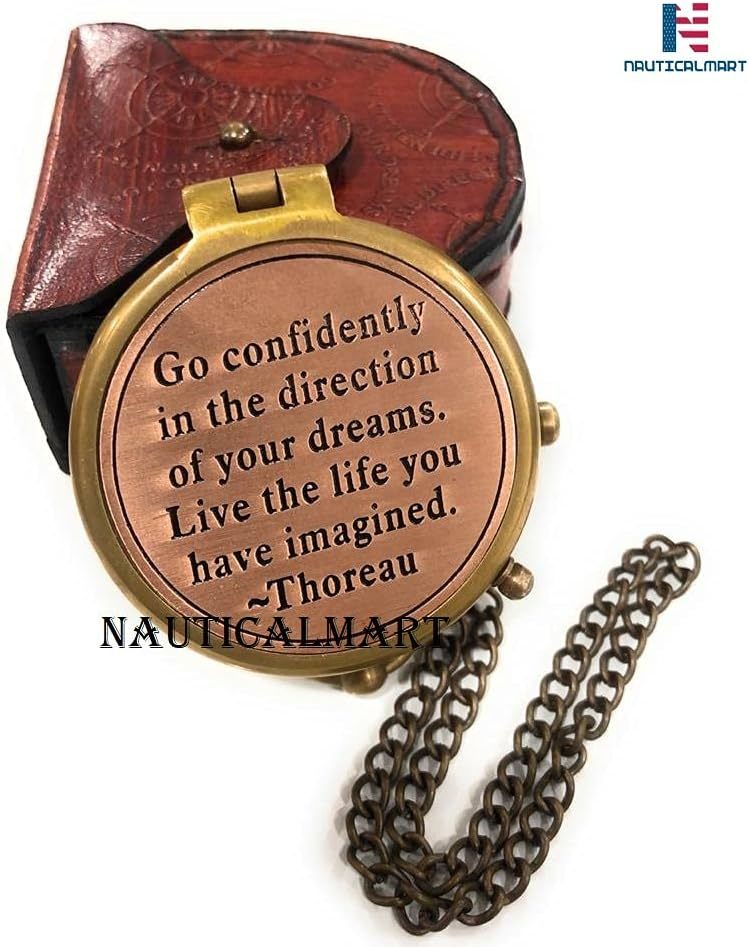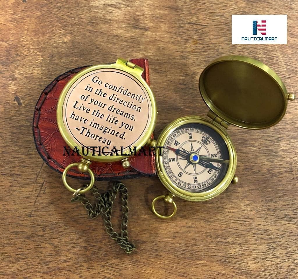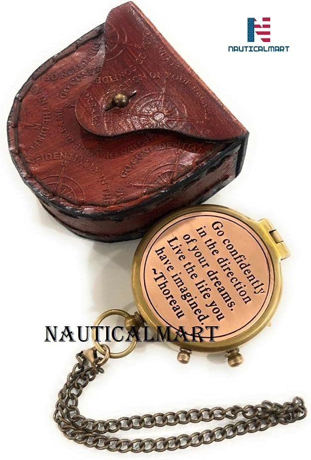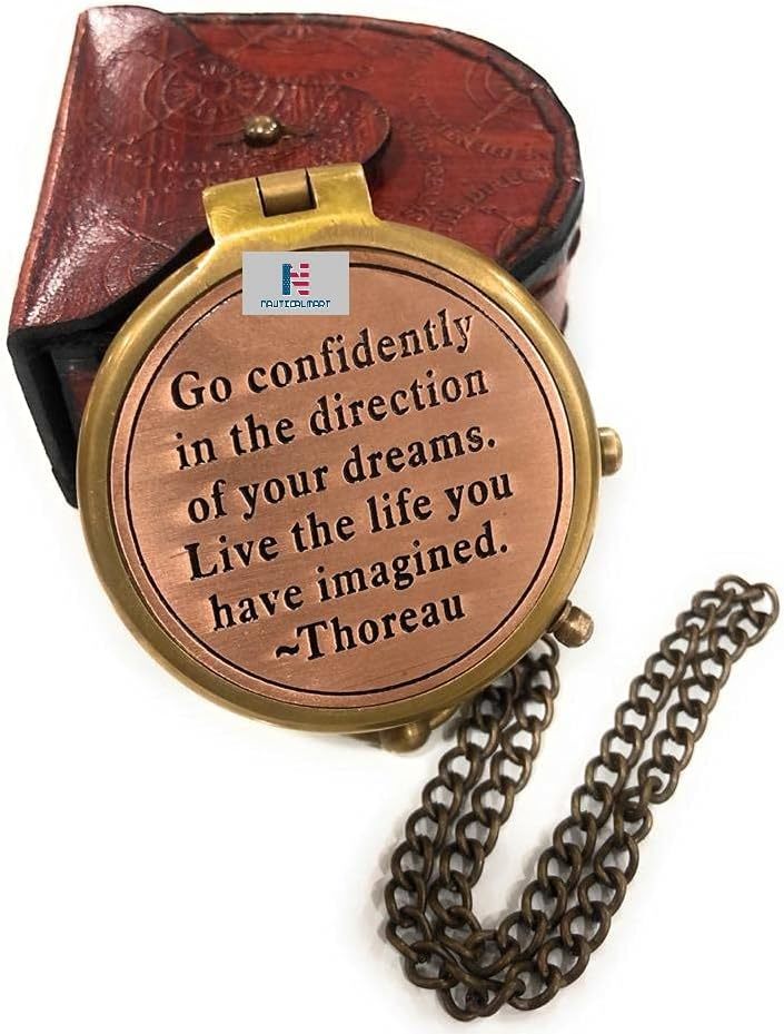 Personalized Gift Compass: Brass Engraved Compass with Stamped Leather case. Brass Compass "GO CONFIDENTLY IN THE DIRECTION OF YOUR DREAMS LIVE THE LIFE YOU HAVE IMAGINED". Under the glass cover is beautiful, the high-quality jewelled compass needle settles to the North very quickly for timely and accurate readings. It has a small lever on the side of the compass that operates a needle lift mechanism to protect the compass bearing. Gift for someone you love. Engraved message of the Compass.