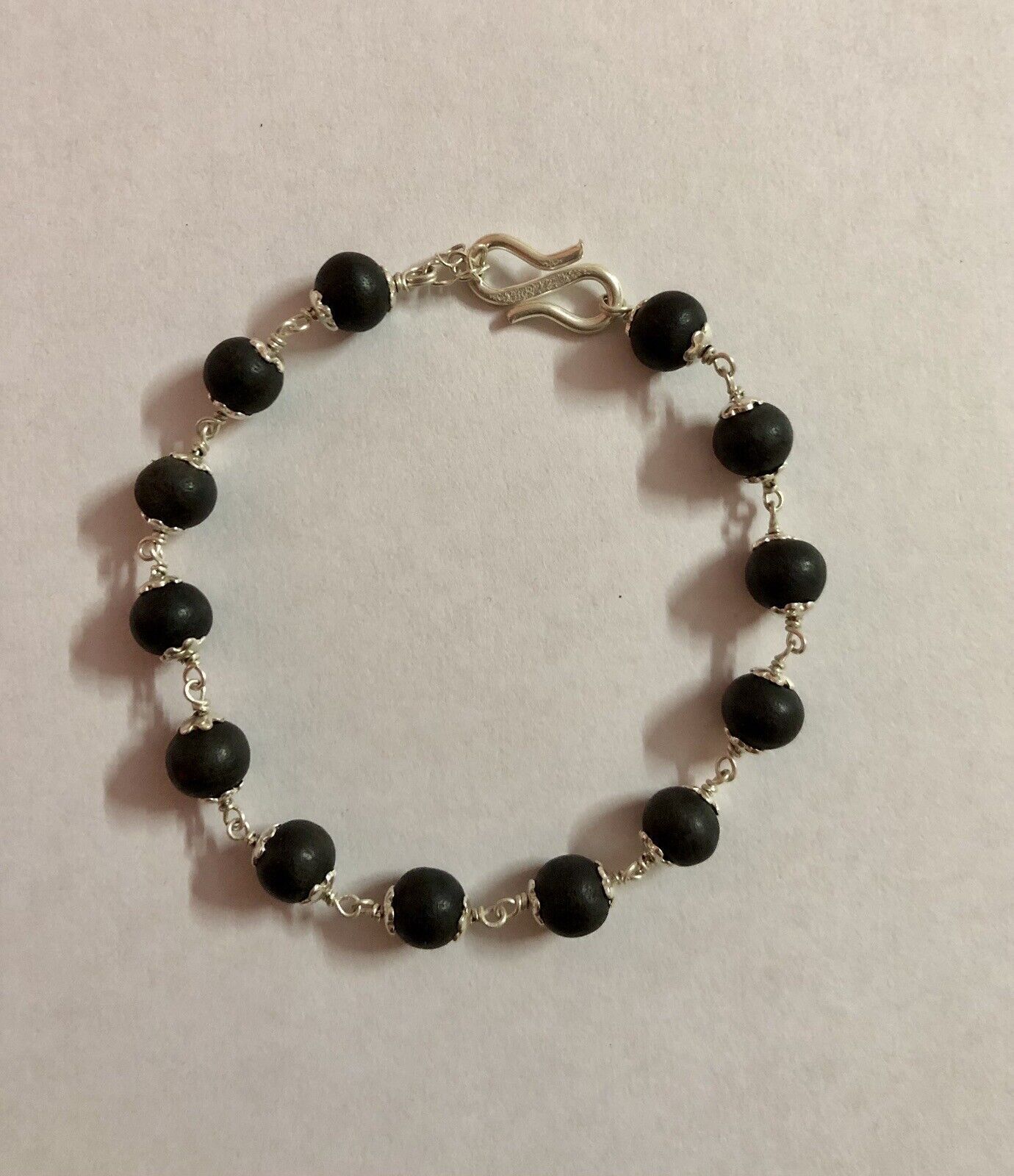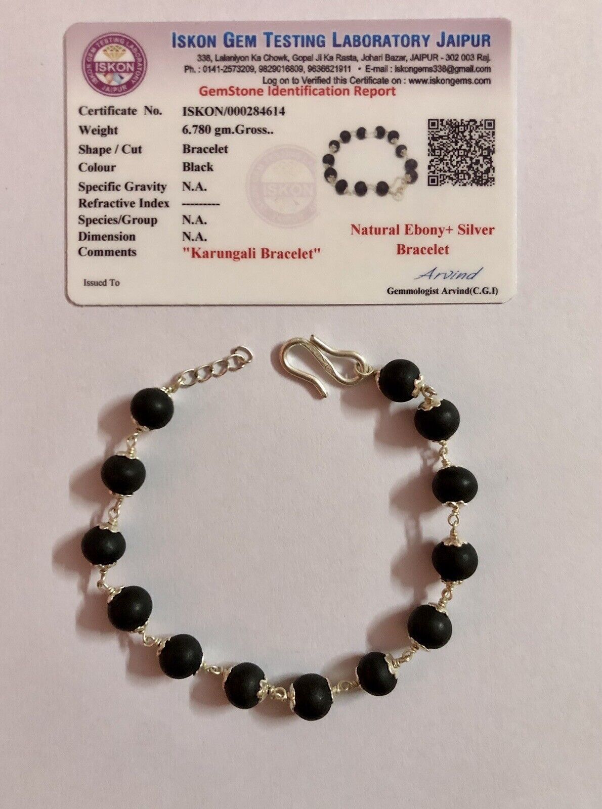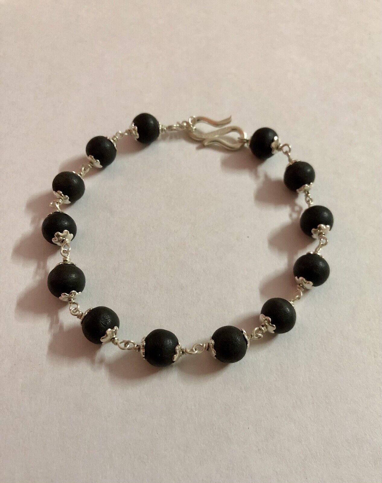 Armband aus 925er-Sterlingsilber + Karungali-Perlen mit natürlichen schwarzen Ebenholzperlen indischen Ursprungs, Yoga-Gebet, Heilung, Meditation