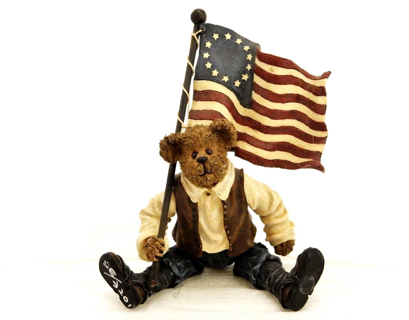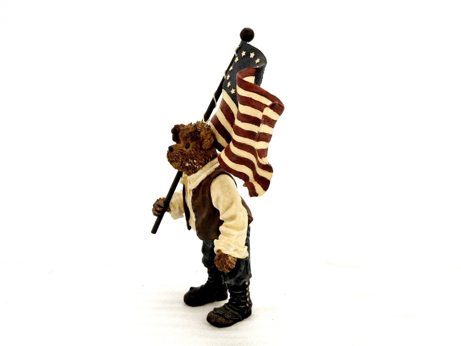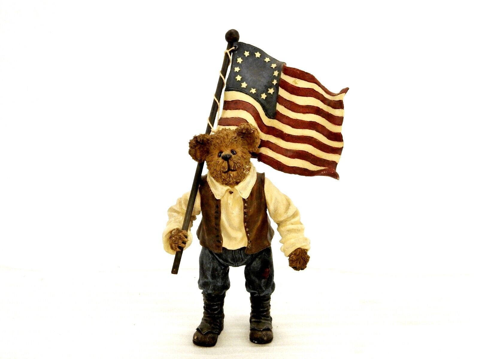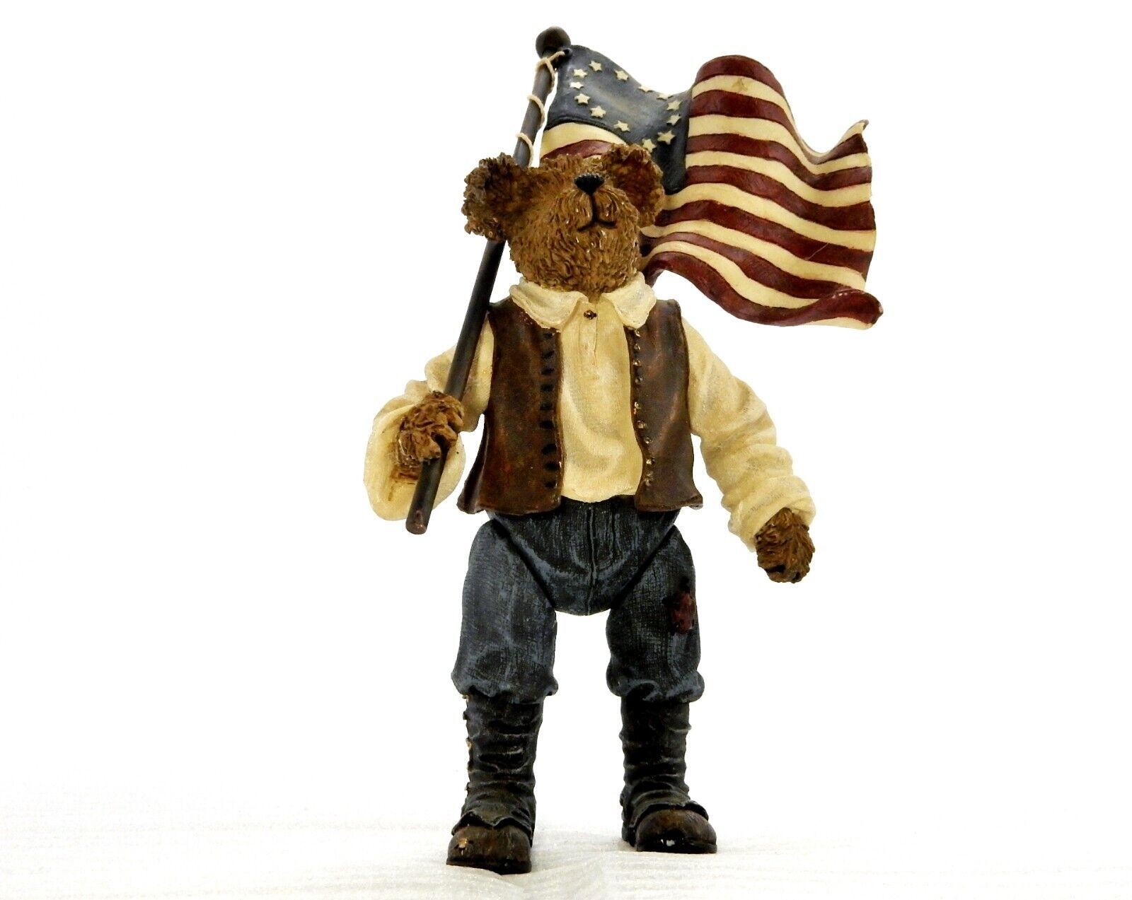 Figurine titled "Patrick the Patriotic Flag Bearer" depicts the bear carrying a wavy 13-star American flag