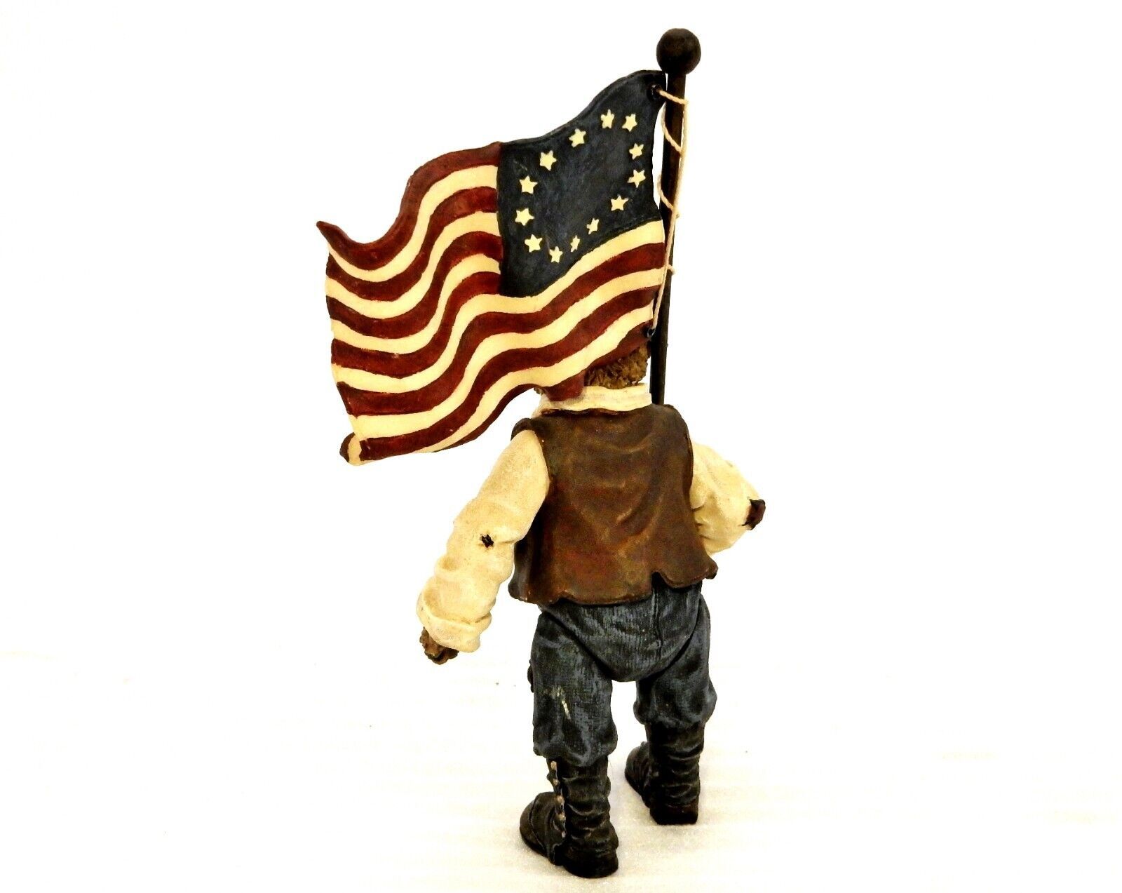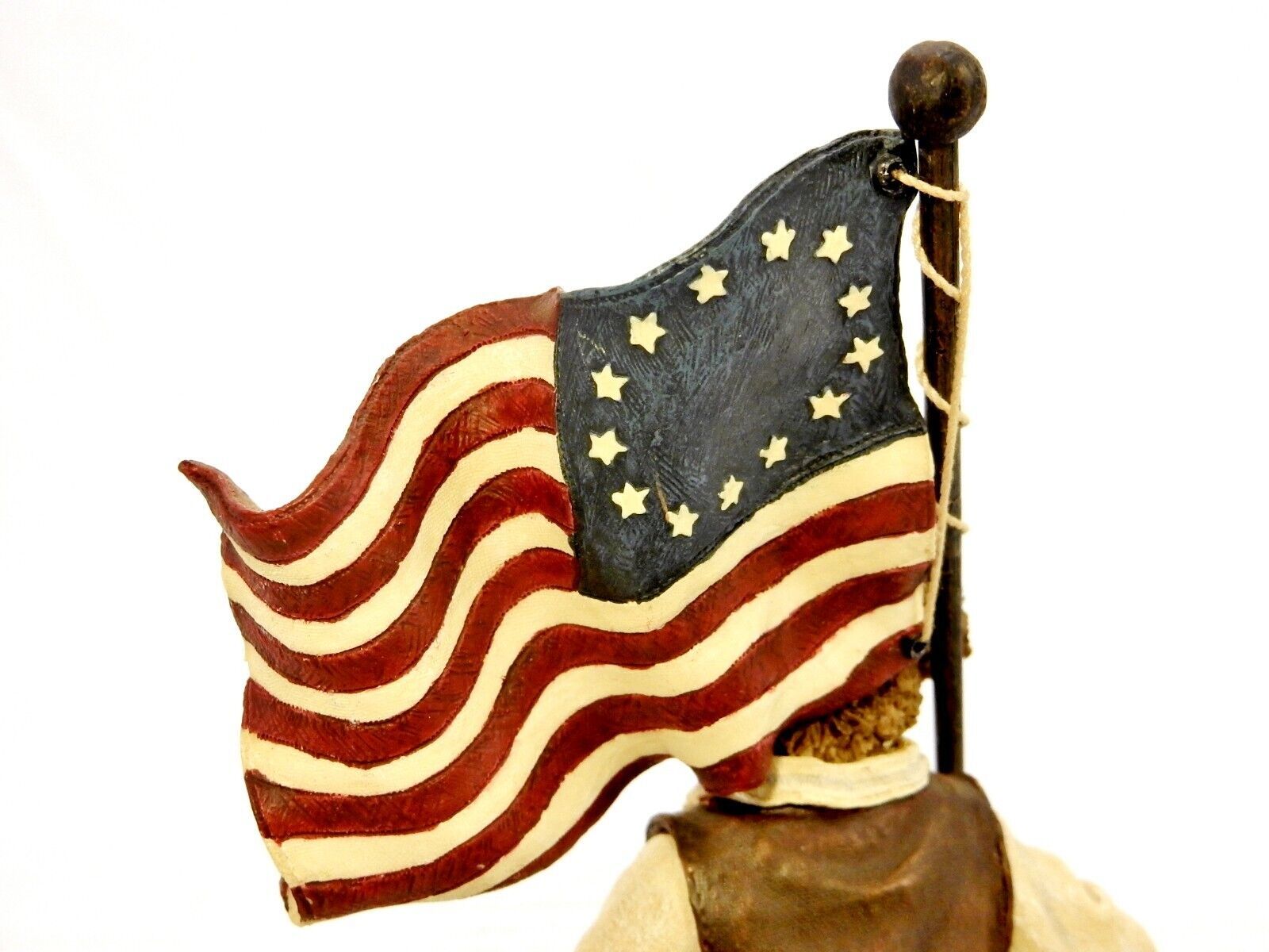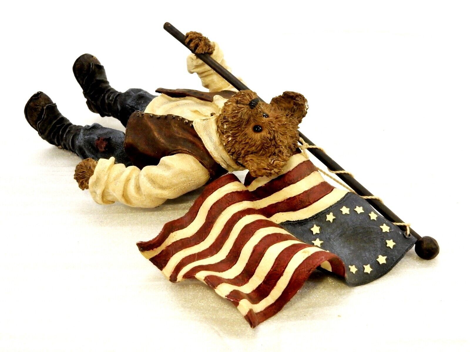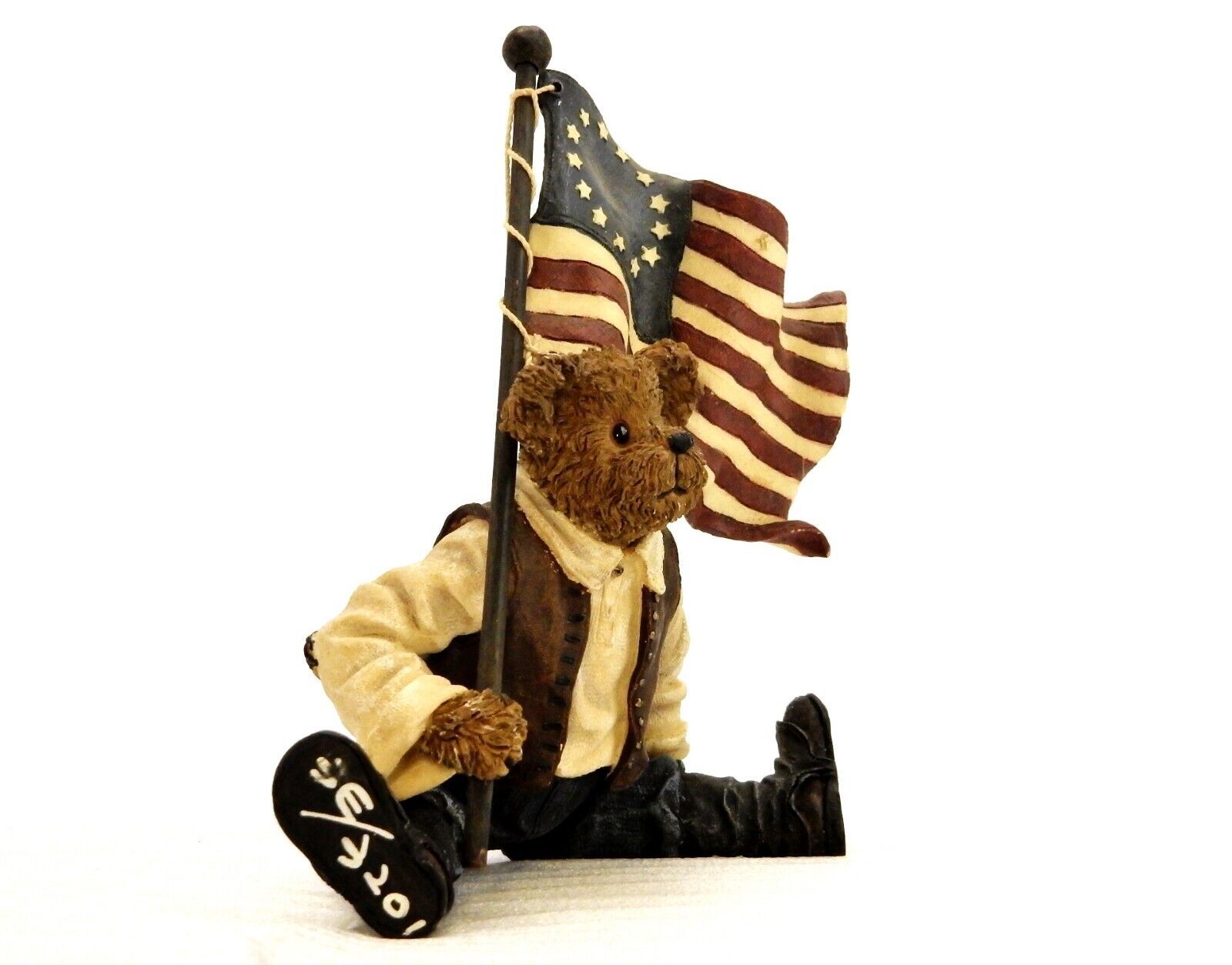 Figurine titled "Patrick the Patriotic Flag Bearer" depicts the bear carrying a wavy 13-star American flag