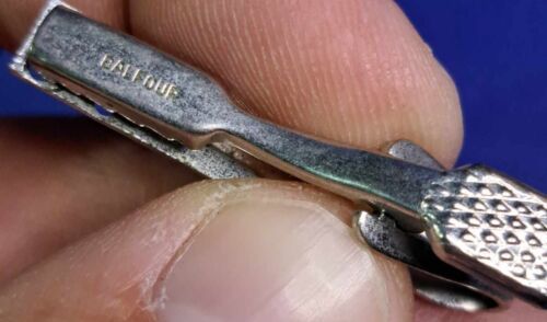 This vintage Balfour tie clip is a must-have for any tie-wearing gentleman. With its sleek silver tone metal design, it adds a touch of class to any outfit. The clip securely holds your tie in place without damaging the fabric.