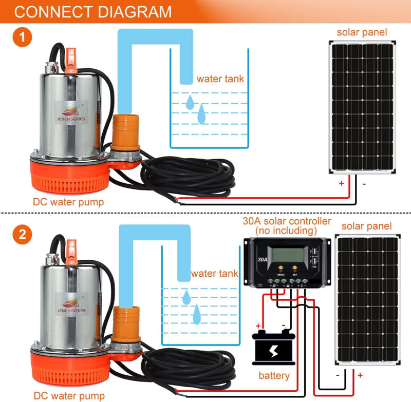 1. [Specification]: JENENSERIES Solar Water Pump 24V DC, 2 Inch Dia, 23ft extension cable, Max head 65.6 ft, 10t/h Flow