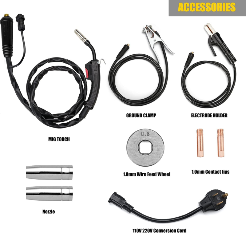 ?Safe and stable welder?The welding machine is designed with 110v/220v dual voltage, stable wire feeding, good arc leading, easy to control and suitable for different welding requirements. MIG/STICK welder is also equipped with overheat protection to improve welding efficiency and ensure your safety. The high performance fan motor provides cooling function to promote the heat dissipation of the machine and prolong the service life of the machine.