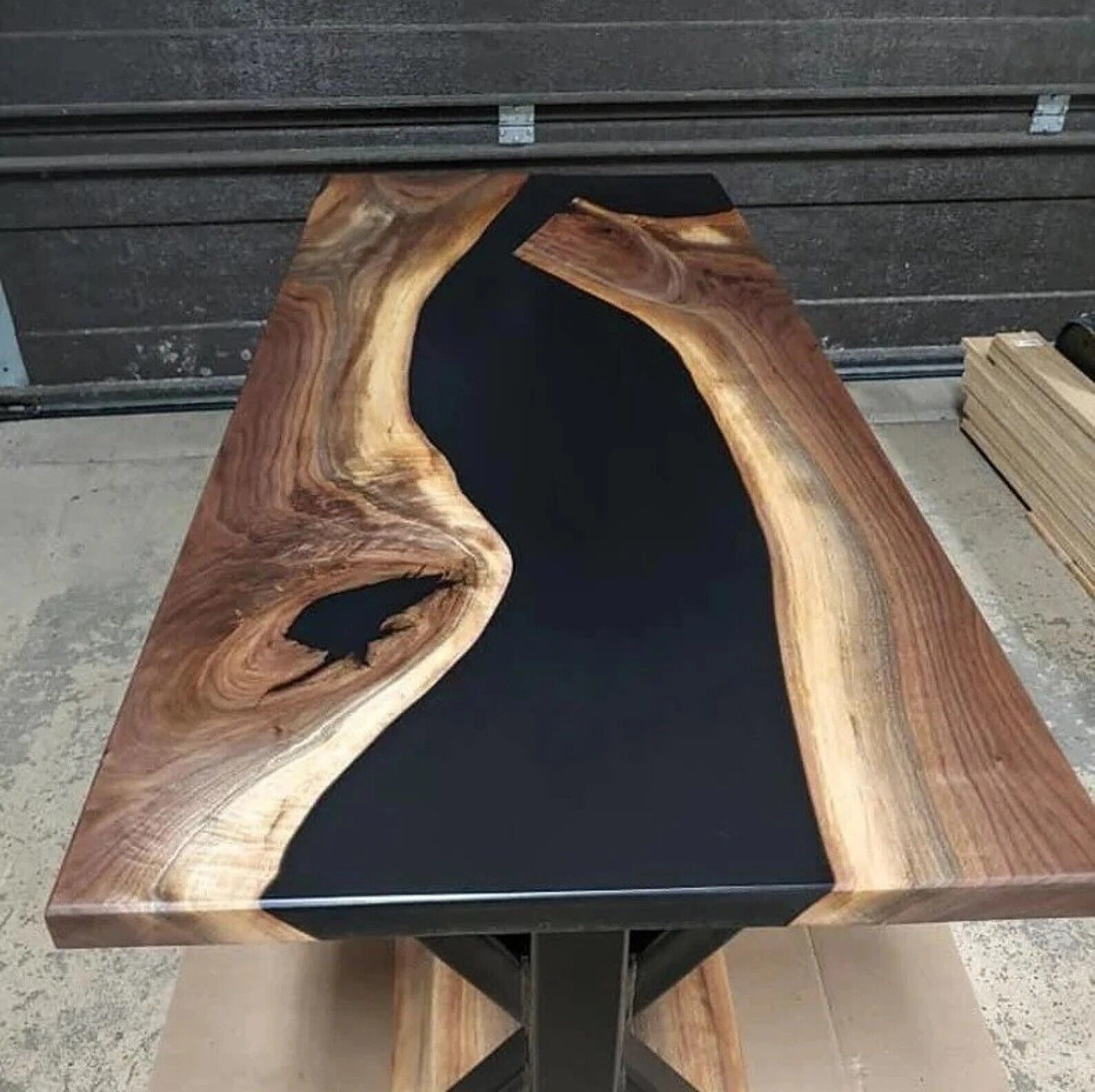 Our epoxy tables are custom-made, and we strive to use the same type of wood as depicted in our advertising pictures. However, it is not always possible to find an exact match, which may result in slight variations in the epoxy color and wood grain pattern.