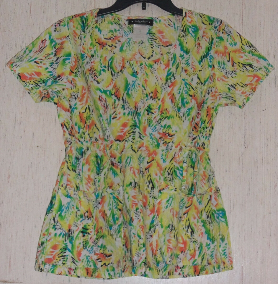 EXCELLENT WOMENS baby phat DOTTED SWISS W/ NOVELTY LOGO PRINT SCRUBS TOP SIZE S