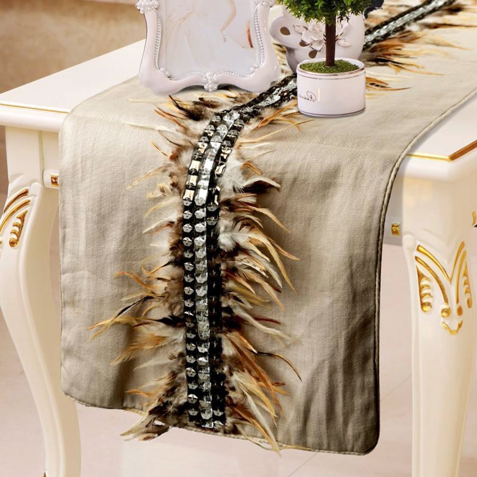 This Feather Dream Table Runner is made from a beautiful Linen fabric with Beaded Embroidery texture and has a complimenting back.