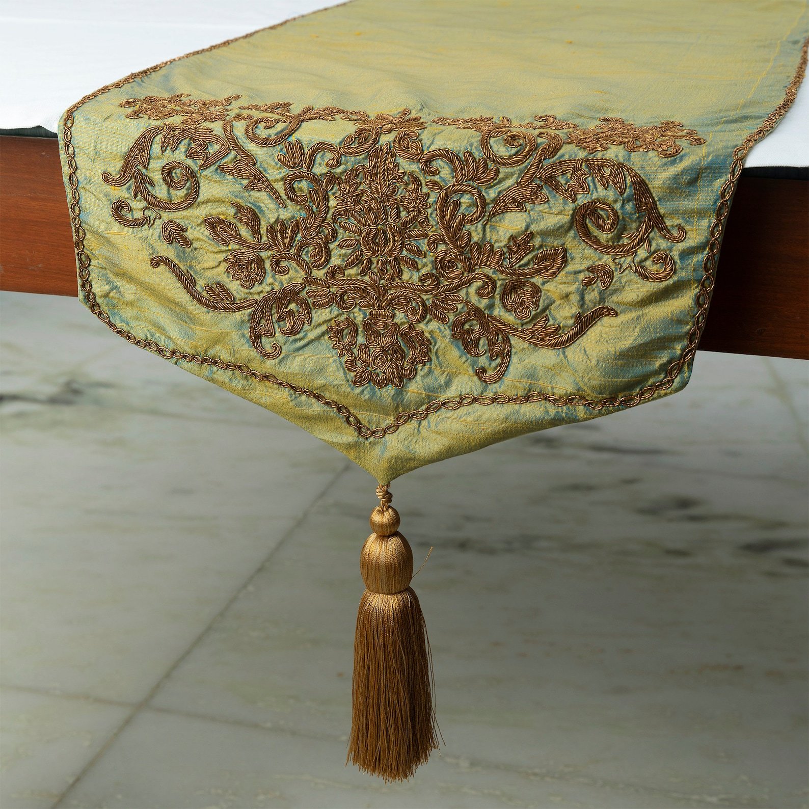 This Orla Table Runner is made from a beautiful Silk fabric with Zardozi Tassels texture and has a complimenting back.