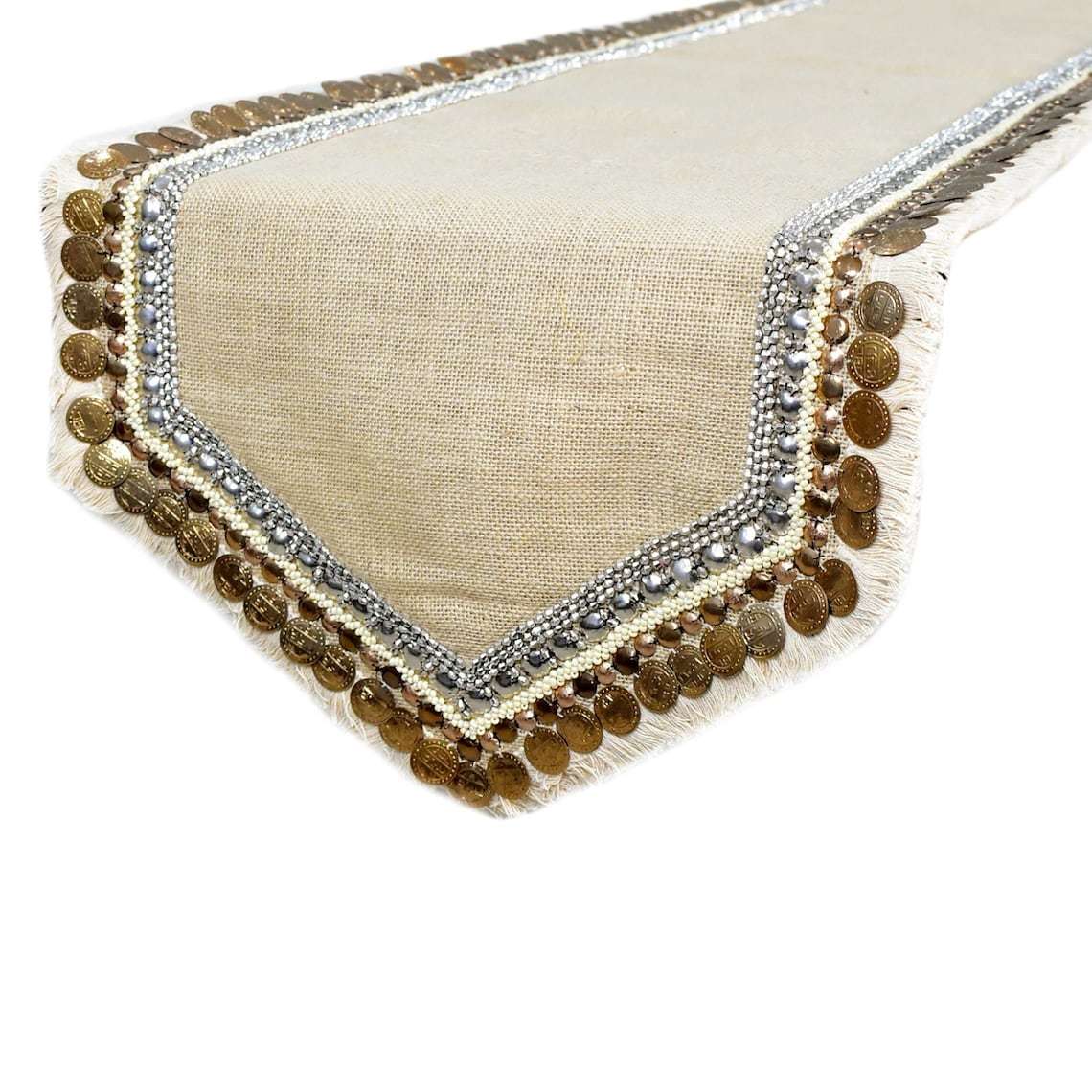 This Marima Table Runner is made from a beautiful Burlap fabric with Lace, Bead, Sequins, Burlap, Embroidered Moroccan texture and has a complimenting back.