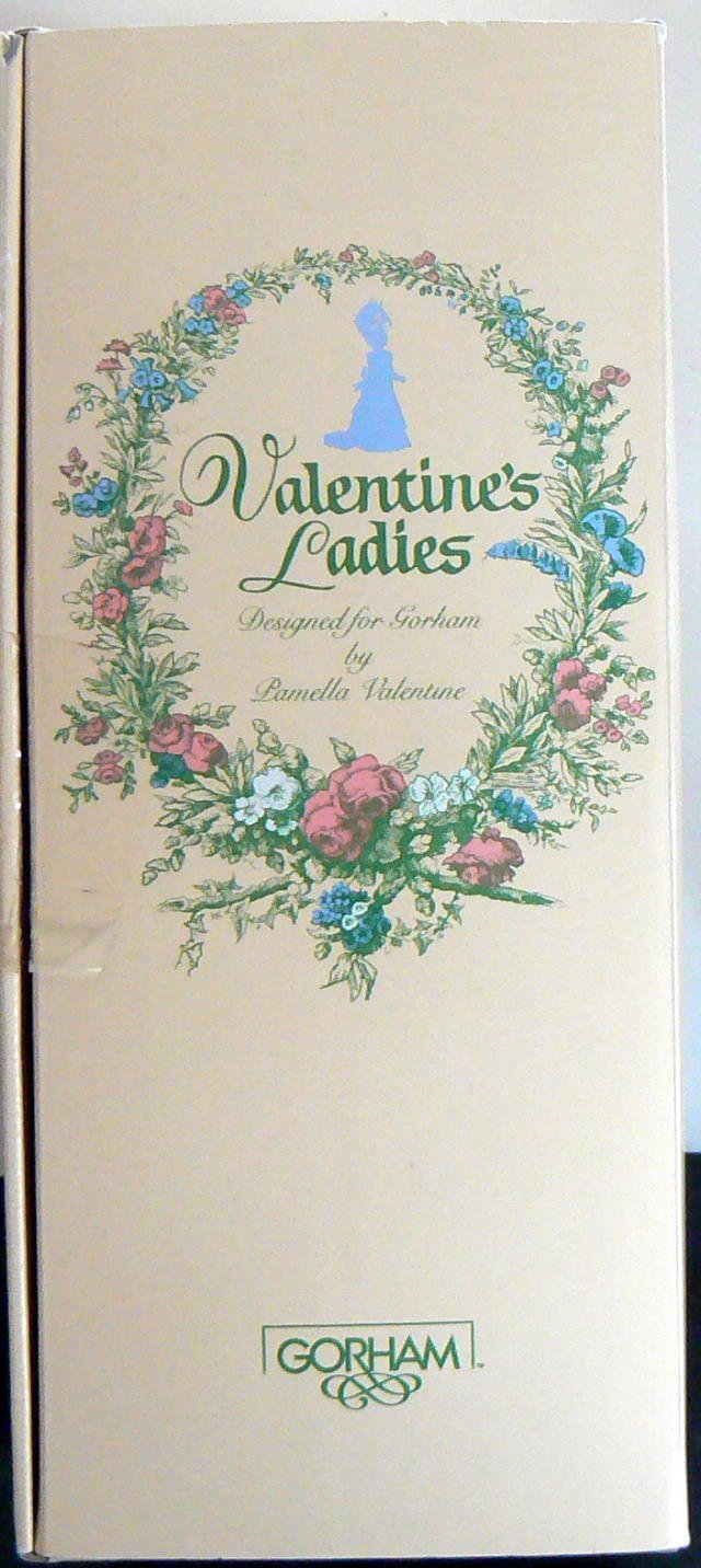 Product description: The Gorham editions of the Valentine Ladies come in a rectangular, cream-colored box. The doll is well-protected in the separated sections. The top of the box has a lovely Victorian logo that also appears on the waist tags. (A picture of the tag and accompanying documentation is on the next page.) On the back of the waist tag is the year and the name of the doll. Fifteen dolls were reproduced by Gorham in conjunction with Pamella and Noel Valentine from 1987-1989. The first 9 dolls were issued in 1987, four in 1988, and the final 2 in 1989.