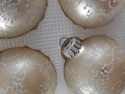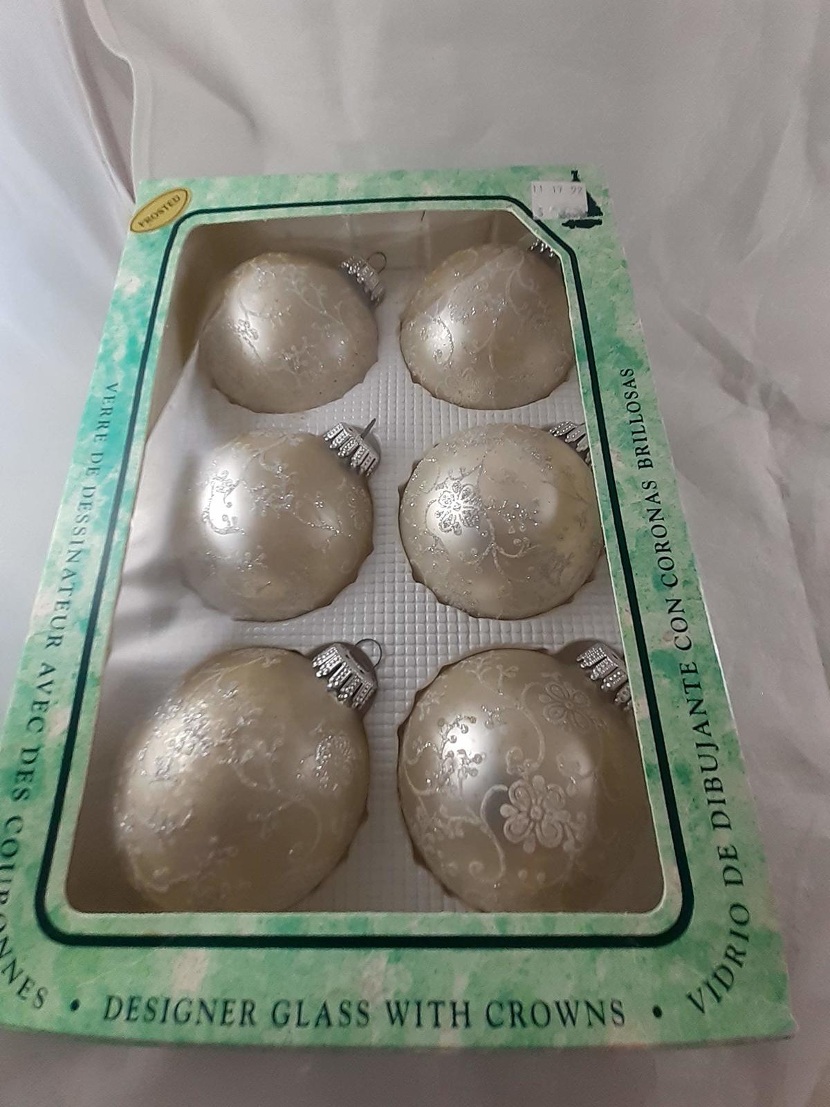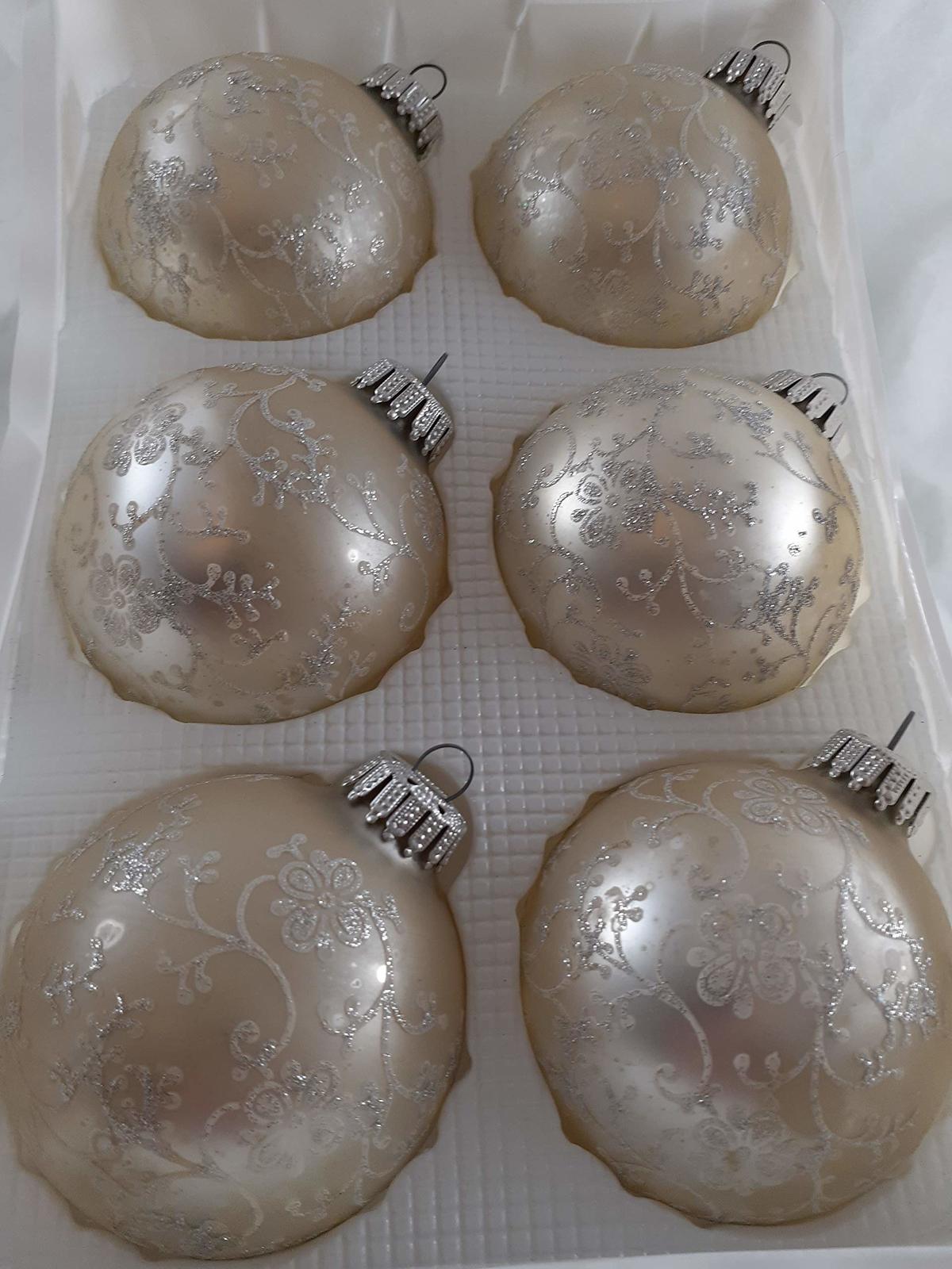 Set of 6 Classic Krebs White Mercury Glass Christmas Ornaments with Silver Glitt