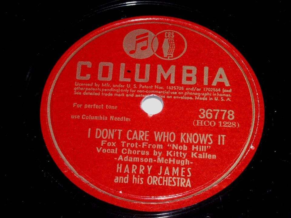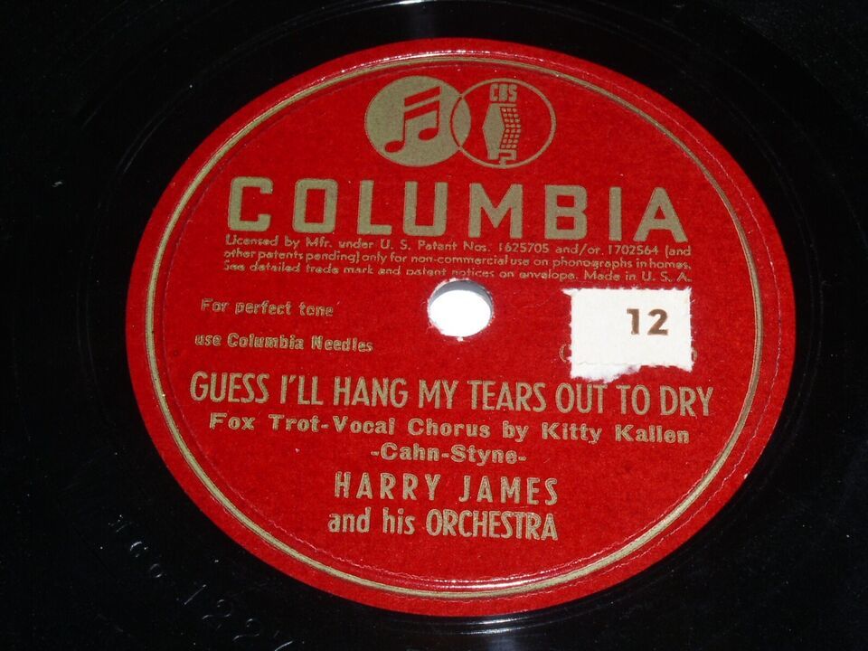 This is a vintage 78 rpm phonograph record by Harry James entitled, "Guess I'll Hang My Tears Out To Dry" Flipside: "I Don't Care Who Knows It". Record label: Columbia 36778.