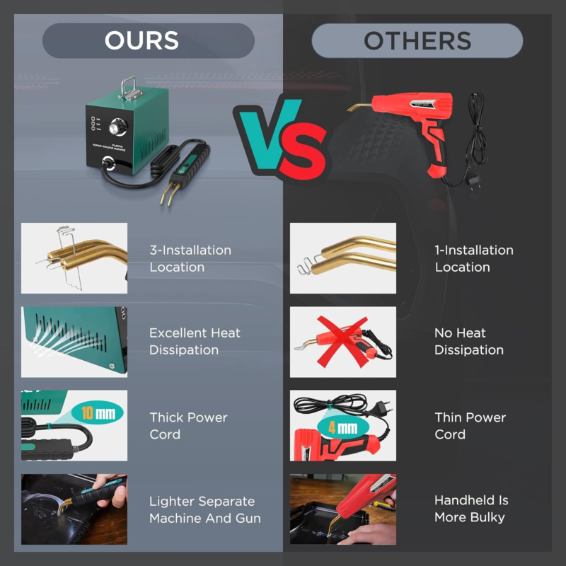 [Widely Used] Professional plastic repair welding machine can be used to repair cracked plastic parts of cars/motorcycles/beach buggies/mowers/boats and suitable for plastic products in home/office/factory floor scenarios. You will find that reinforcing plastic with this product is fast, strong and economical. We offer 30 days money back and 2 years warranties. If you have any problem with it, please feel free to reach us and we will solve your problem within 24 hours.
