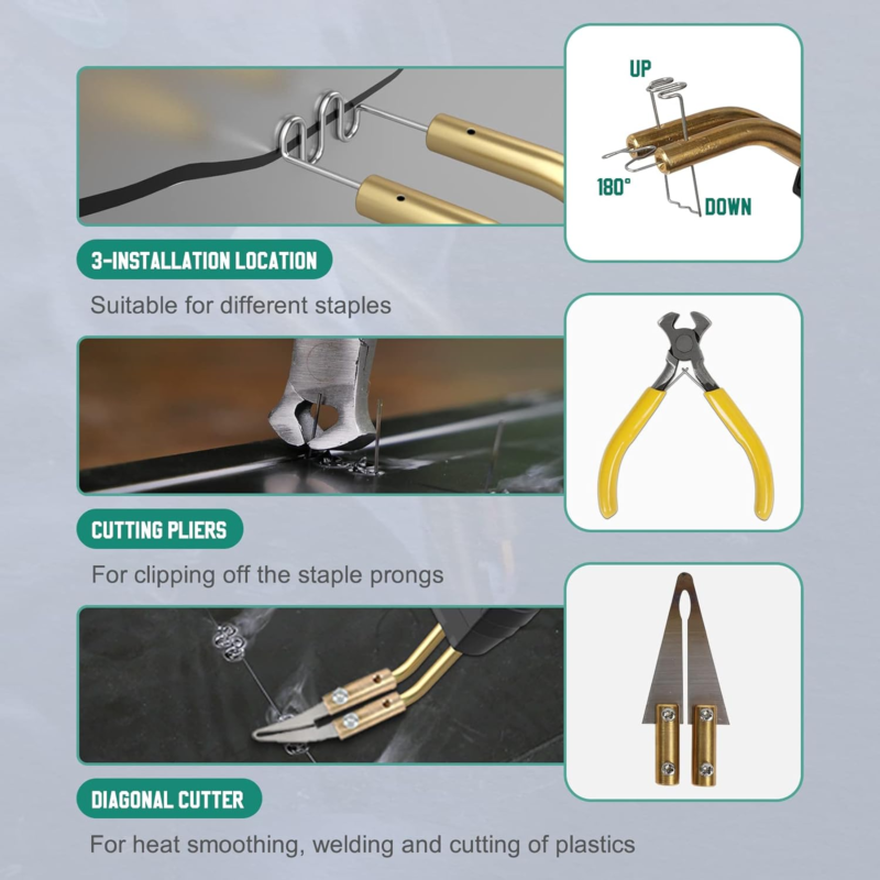 [Multi-Angle Mounting Stapler] The plastic repair welder kit includes 100pcs each of six types of welding staples (0.6/0.8mm flat stapler, 0.6/0.8 wave stapler, V-shaped stapler, M-shaped stapler).Repair The stapler can handle a variety of tricky welding angles,welding points can be attached to the stapler from 3 directions (up, down, 180) to seamlessly weld plastic parts with cracks, breaks, inside and outside corners, and other multi-directional problems.