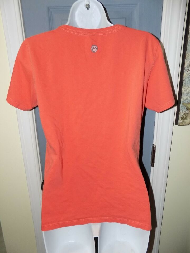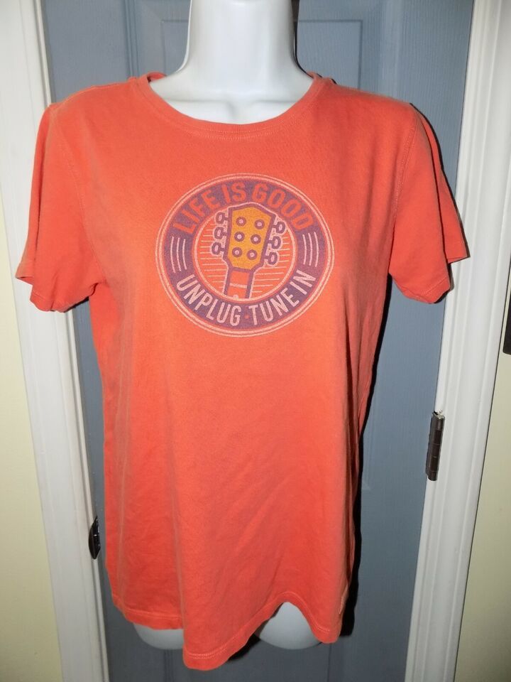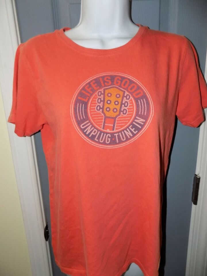 Life is Good Orange Guitar Unplug Tune In Themed T-Shirt Size S Women's EUC