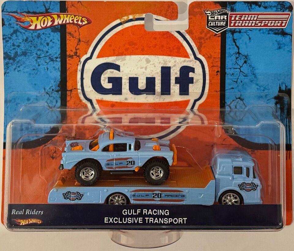Chevy Big Air Bel Air Custom Hot Wheels Team Transport GULF RACING Series with Real Rider Rubber Wheels 1:64 Scale Collectible Die Cast Model Car.