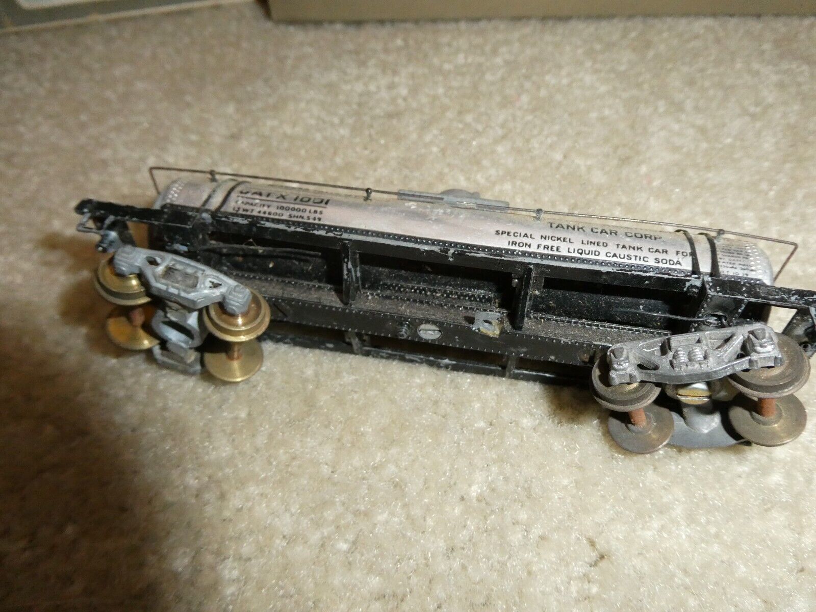 You are bidding on a circa 1950s to 60s era, not sure, an old kit built, metal, Great American Tank Car Corp The Mathieson Alkali Works, tank car in the pictures. 5 inches long. Good shape, lots of general paint wear, nicks and chips, some light metal rusting, missing brake wheel and both couplers, maybe could use some cleaning or use as shown. Zoom in for details.