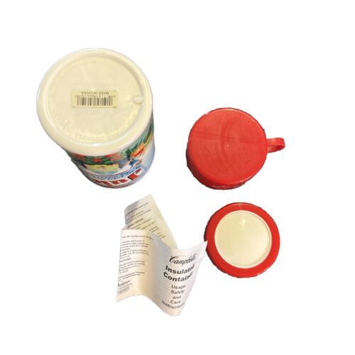 This Campbell's Juicy Tomatoes Soup-Container Thermos from 2006 is a must-have for any soup or advertising collector. With its bright and vibrant colors, this original United States-made thermos features the iconic Campbell's Soup brand and is perfect for keeping your drinks hot or cold on-the-go. The thermos is in excellent condition and has not been modified in any way. Add this unique and collectible item to your collection today!