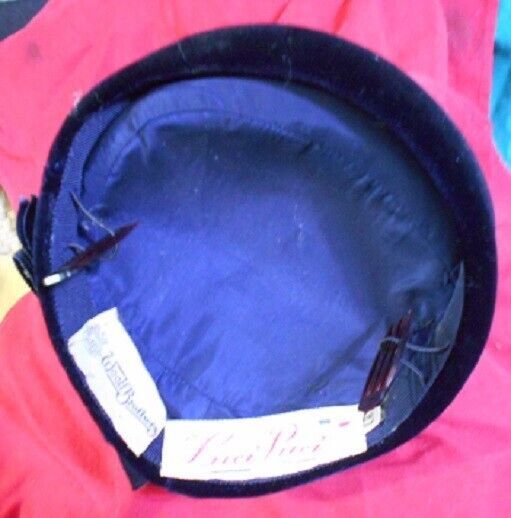 These are real genuine ol' timey ladies hats. These came out of an old steamer trunk. One has a tag that reads medium; and the other has tags that read: Woolf Brothers, Luci Puci, size 22, hat.