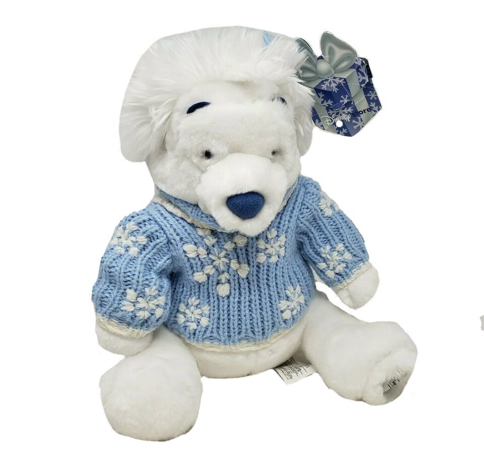 DISNEY STORE WINNIE THE POOH WHITE WINTER SWEATER SNOW STUFFED ANIMAL PLUSH TOY