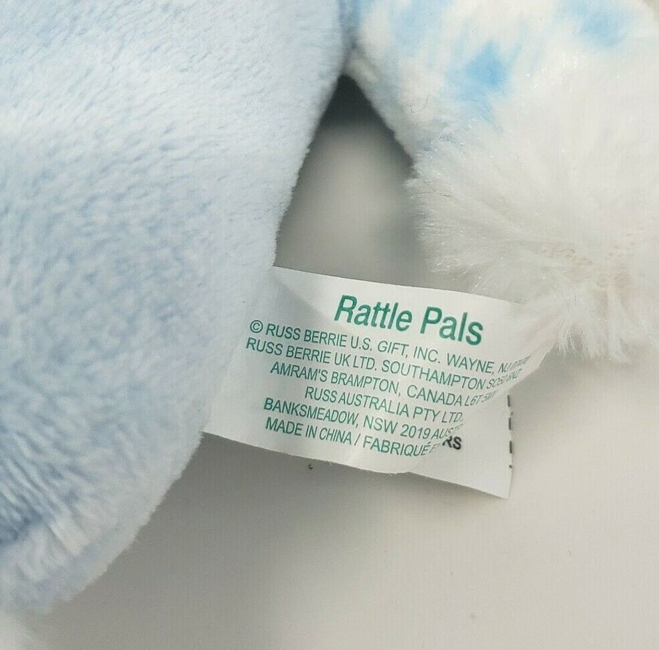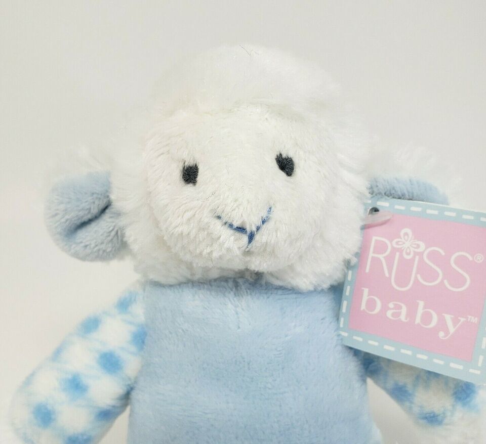 6" RUSS BERRIE BABY WHITE AND BLUE LAMB RATTLE PALS STUFFED ANIMAL PLUSH TOY