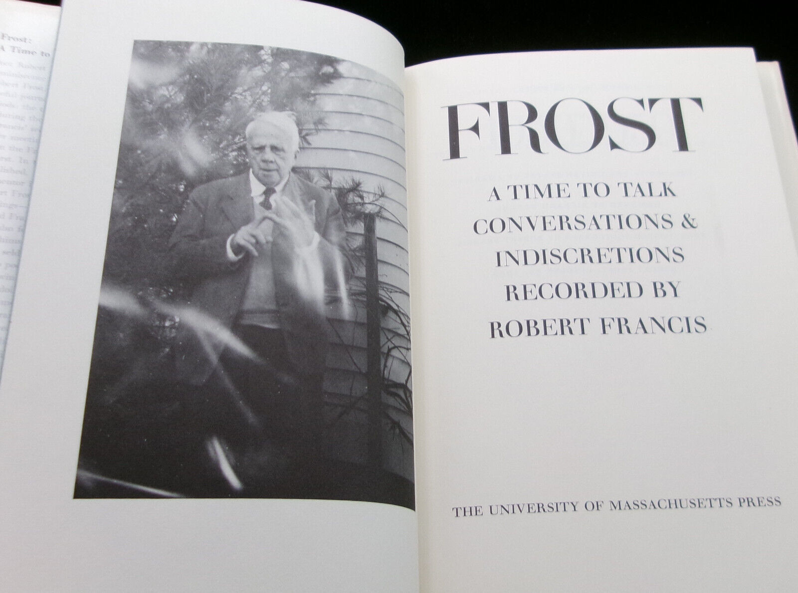 Conversations with Frost in several sections: 1955/1959; 1933/1935; with an epilogue that includes: "Frost at Eighty"; "The Robert Frost Memorial Service" and an essay "Frost Today."