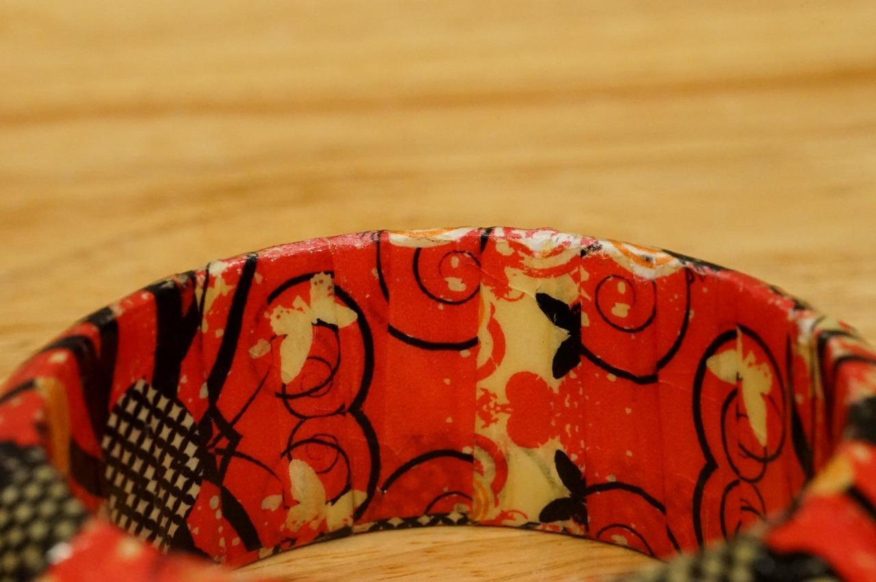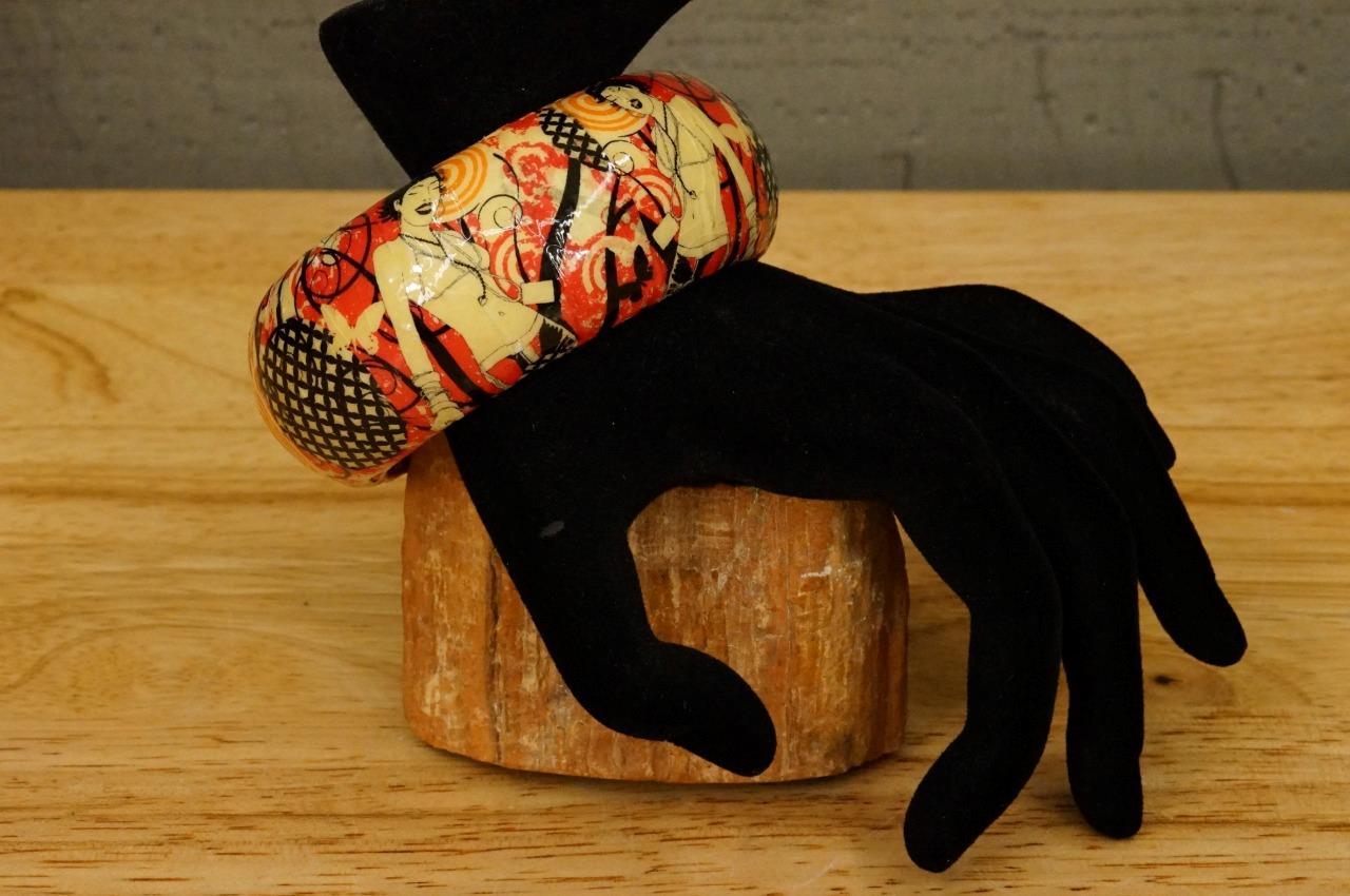 Vintage Jewelry Fashionista Ladies Black Hot Pink Wrapped Chunky Bangle Bracelet. 1990's era. Measures 1-3/8" tall. The opening Diameter is 2-5/8". Features asian ladies in bikini tops with short black hair. Vibrant pink, black and orange colors. Some crazing noted in the finish from age. Very wearable. No smoke or pet odors.