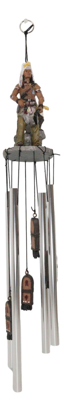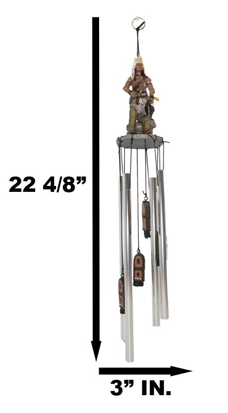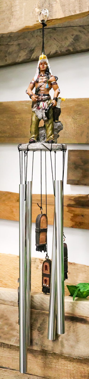 ? Introducing our Native Indian Hunter Warrior Wind Chime, a majestic and culturally rich addition to your home decor. Crafted with intricate detail, this wind chime features a fearless warrior adorned with a striking eagle headdress, symbolizing strength and freedom. The warrior holds a finely carved axe, adding a touch of traditional craftsmanship.