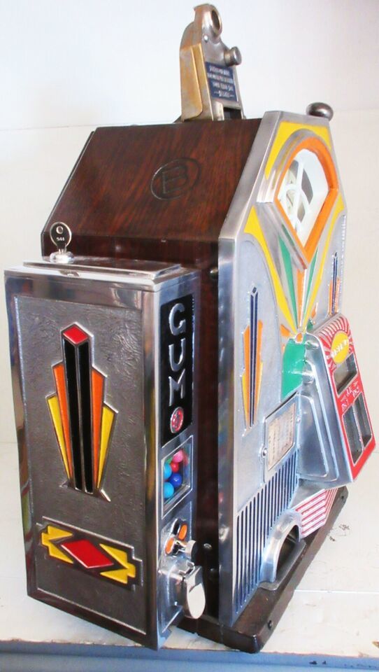 A visually attractive Art Deco aluminum front casting enhanced with various vibrant paint colors is encased in a beautiful solid oak cabinet. The machine was originally designed in the early 1930's by E.C. Bignell, a French manufacturer, who distributed Jennings machines.