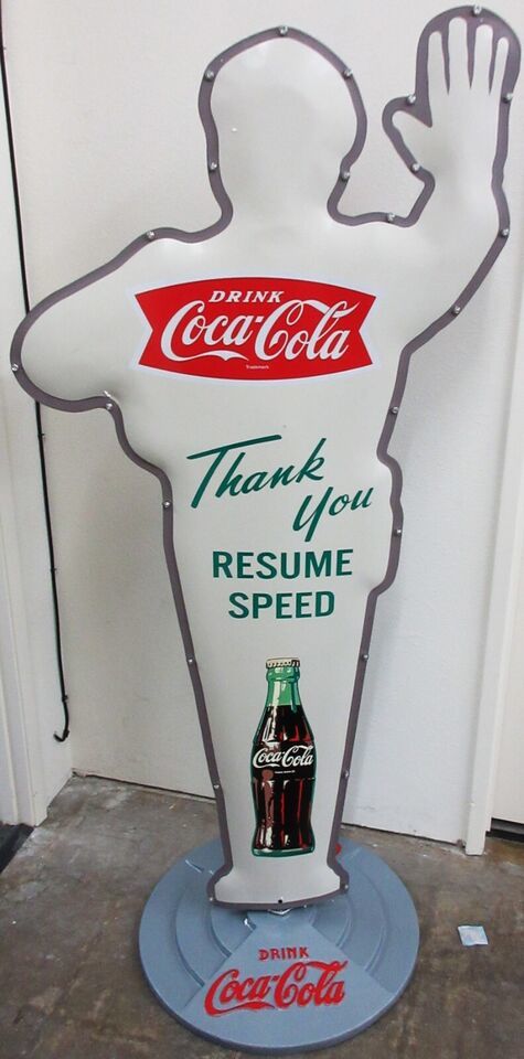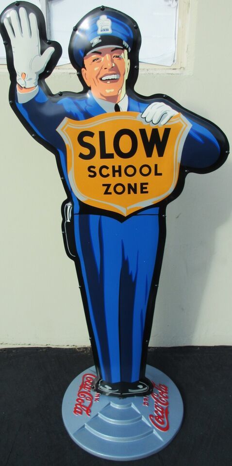 Policeman school guard with Coca-Cola theme crossing sign.