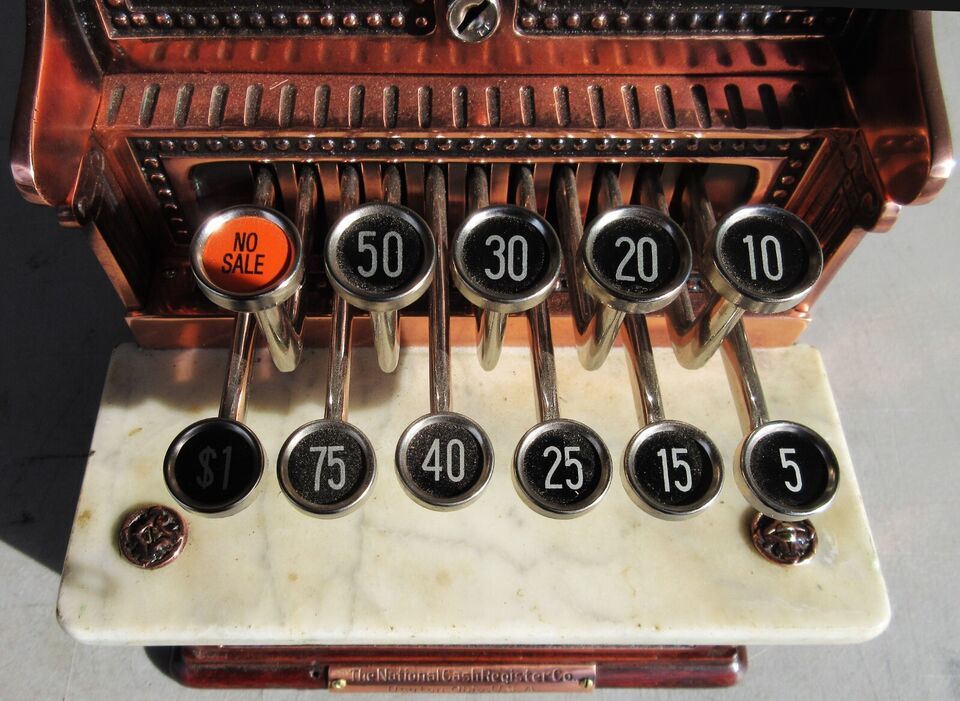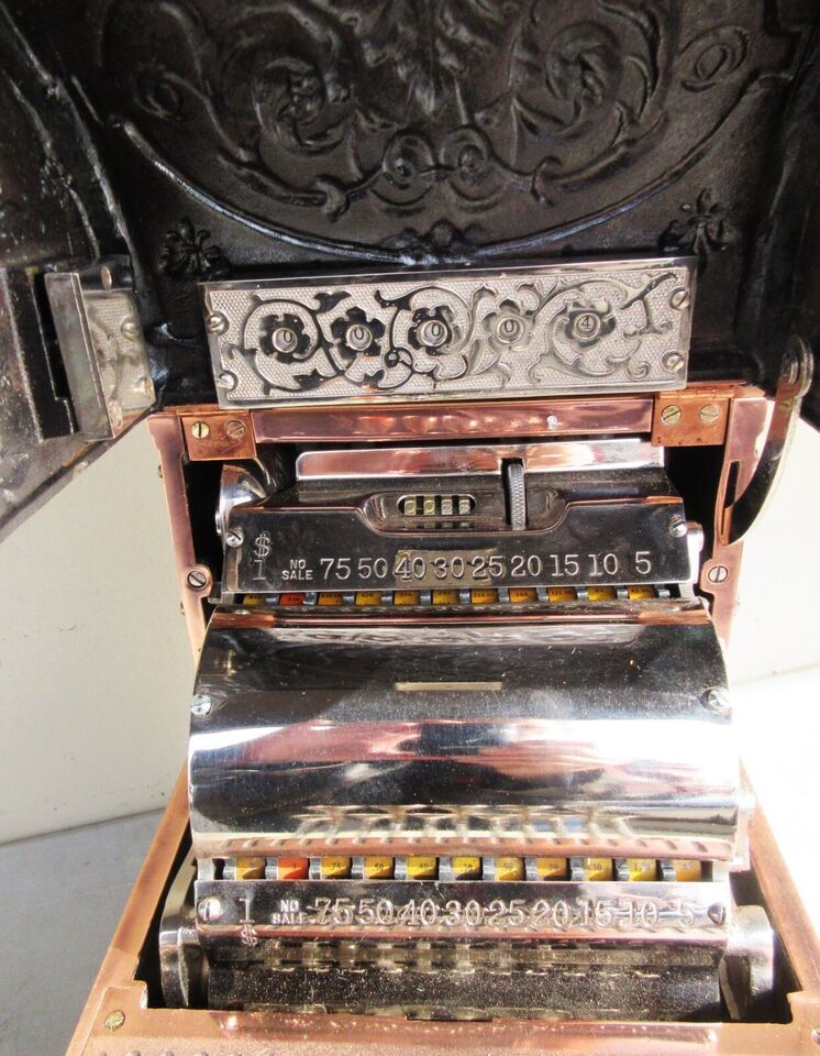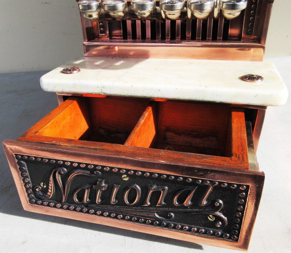 A fully restored National Cash Register (NCR) Model #216 antique bronze finish detail- adder register serial #793444.