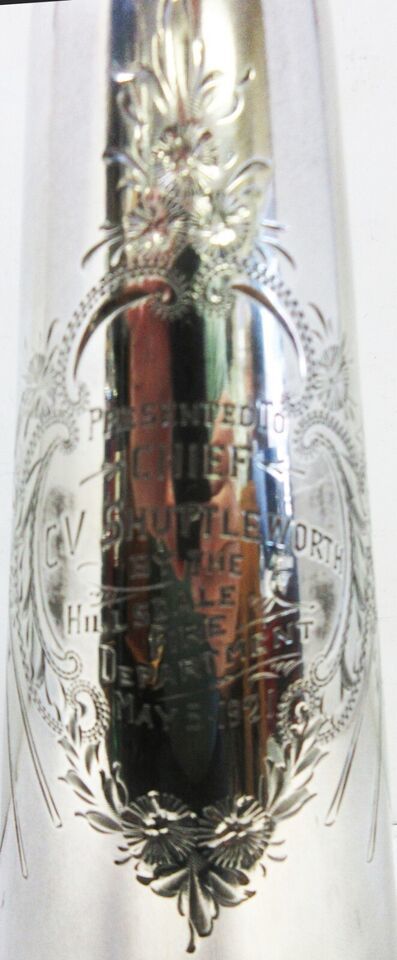 "Presented to CV Shuttleworth by the Hillsdale Fire Department May 5 1921"