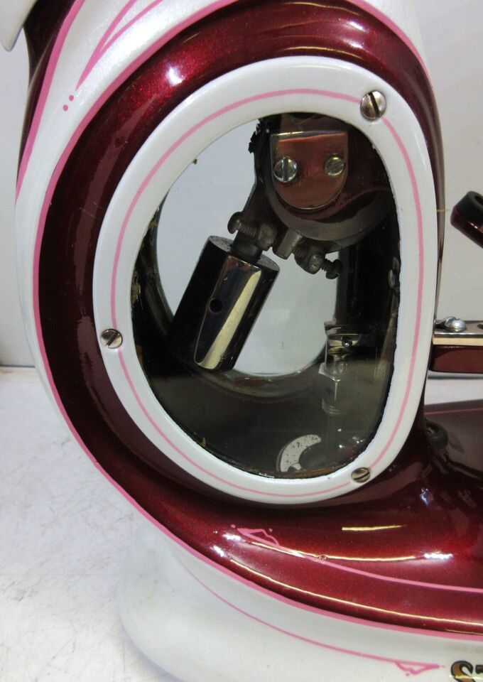 Painted in an two tone automotive maroon and off white finish detailed in a light green pin stripping.