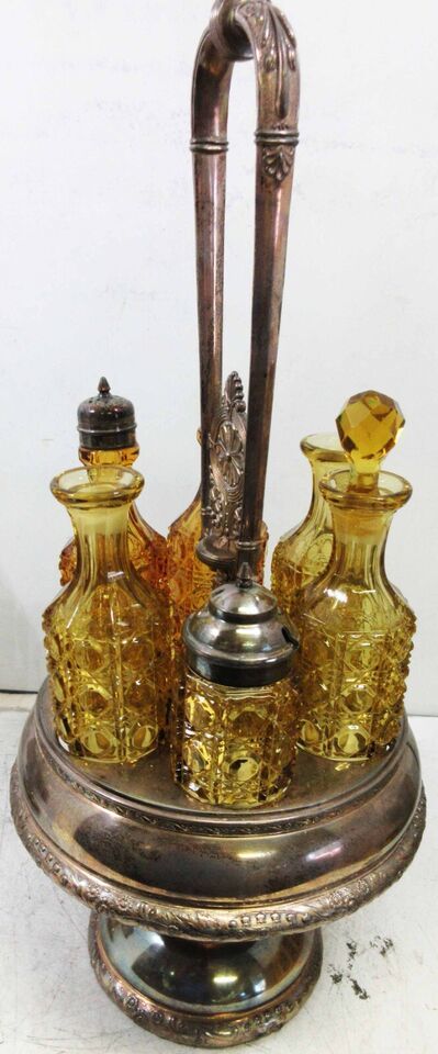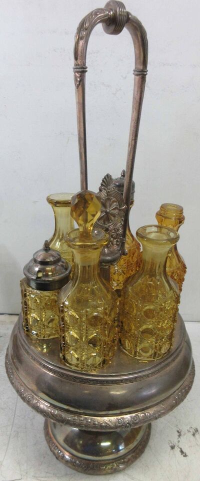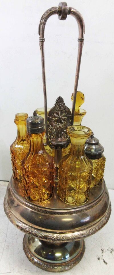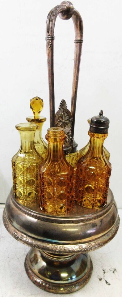 Six amber bottles cruet set displayed in a silver plated etched holder