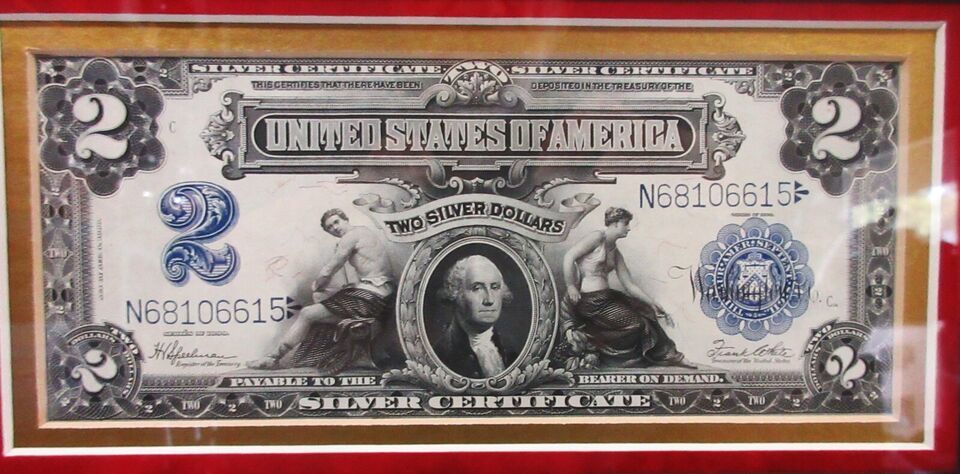 The two dollar bill features a portrait of President Washington between the figures of Trade and Agriculture with the large blue Treasury Seal to the right serial # N68106615.