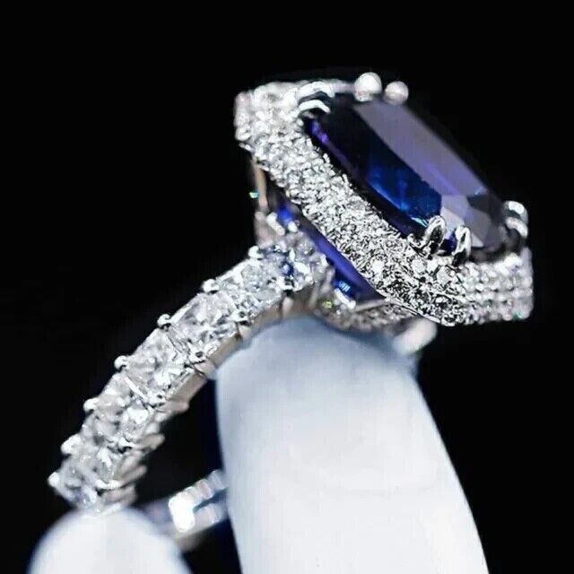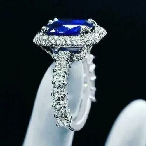 4Ct Cushion Cut Lab Created Blue Sapphire Engagement Ring 14K White Gold Plated