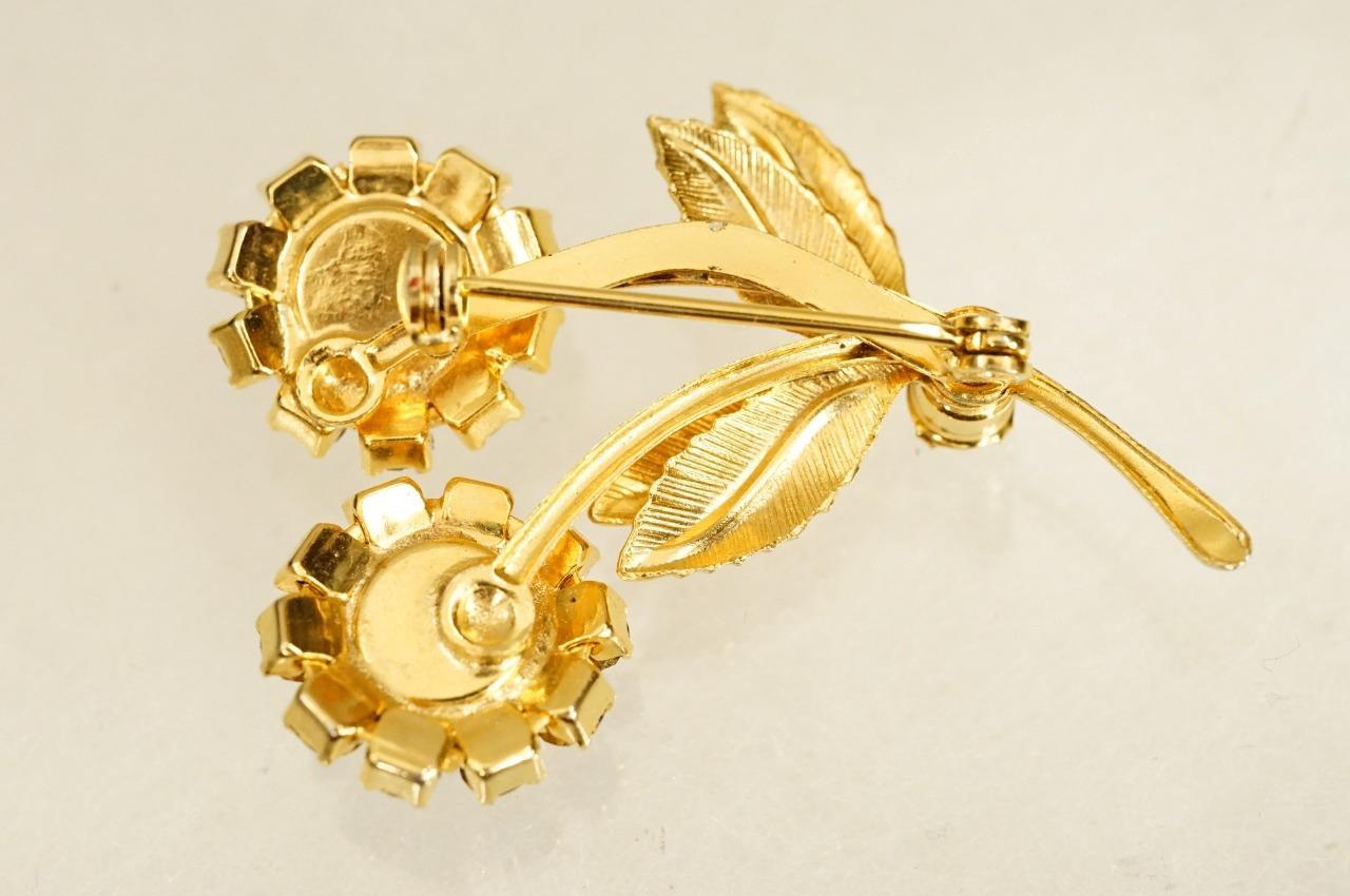 Vintage Costume Jewelry Brushed Gold Tone Brown Rhinestone Flower Brooch Pin. Twin flowers with prong set golden brown rhinestones. Clear accent stone on the stem. Measures 1-5/8" tall.