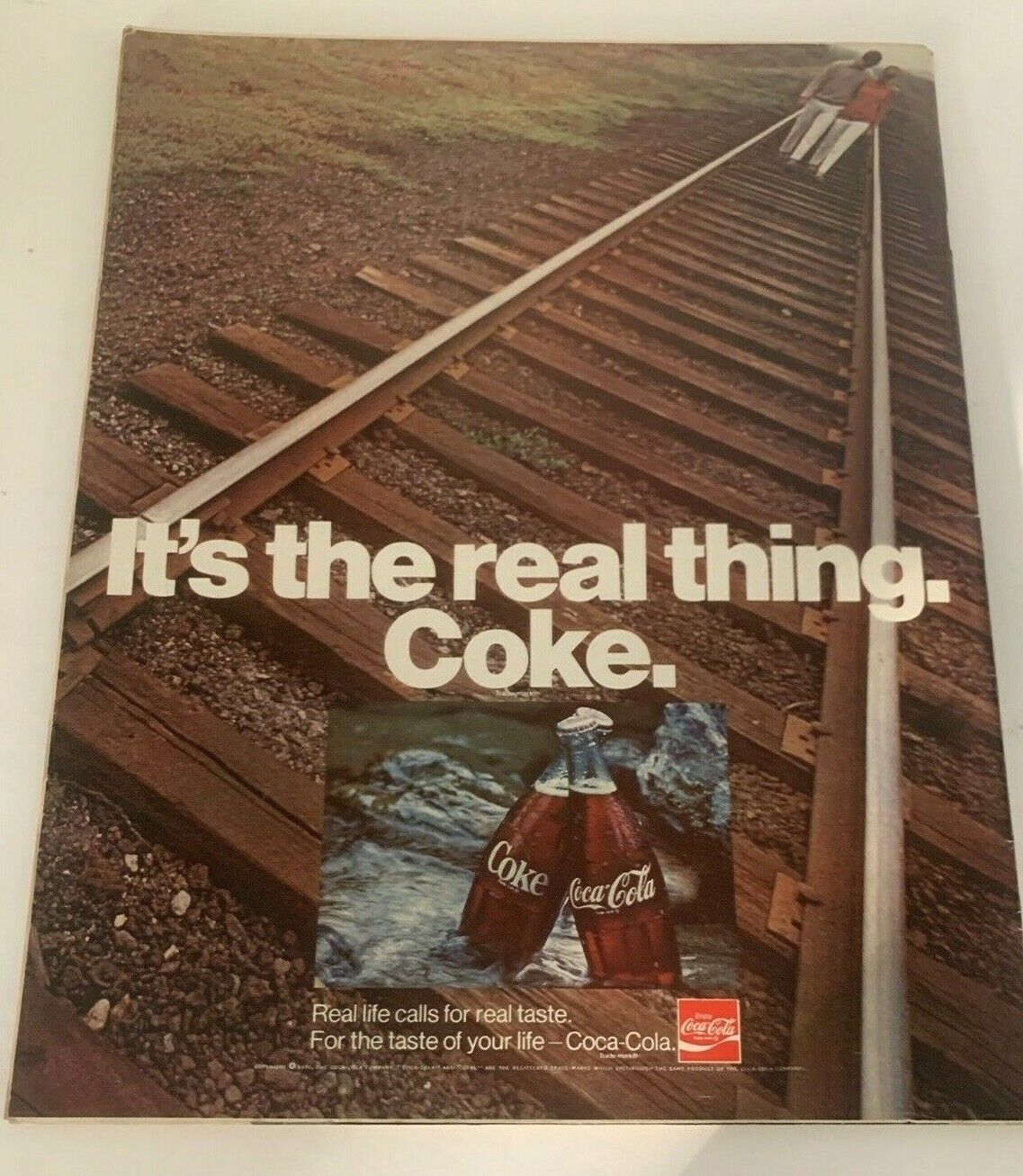 1970 Coca Cola Real Thing, annuncio stampa vintage sui binari della ferrovia