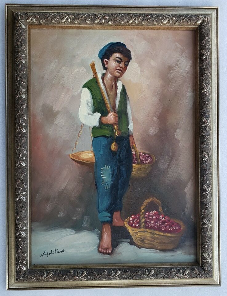 Vintage Rare NAPOLITANO Mid 20th Century Naples, Italy Original Oil Painting. Portrait of a young Italian boy. Painting is in great condition as displayed in photo gallery. Framed on canvas. Measures 33 1/4 by 25 1/4 inches.