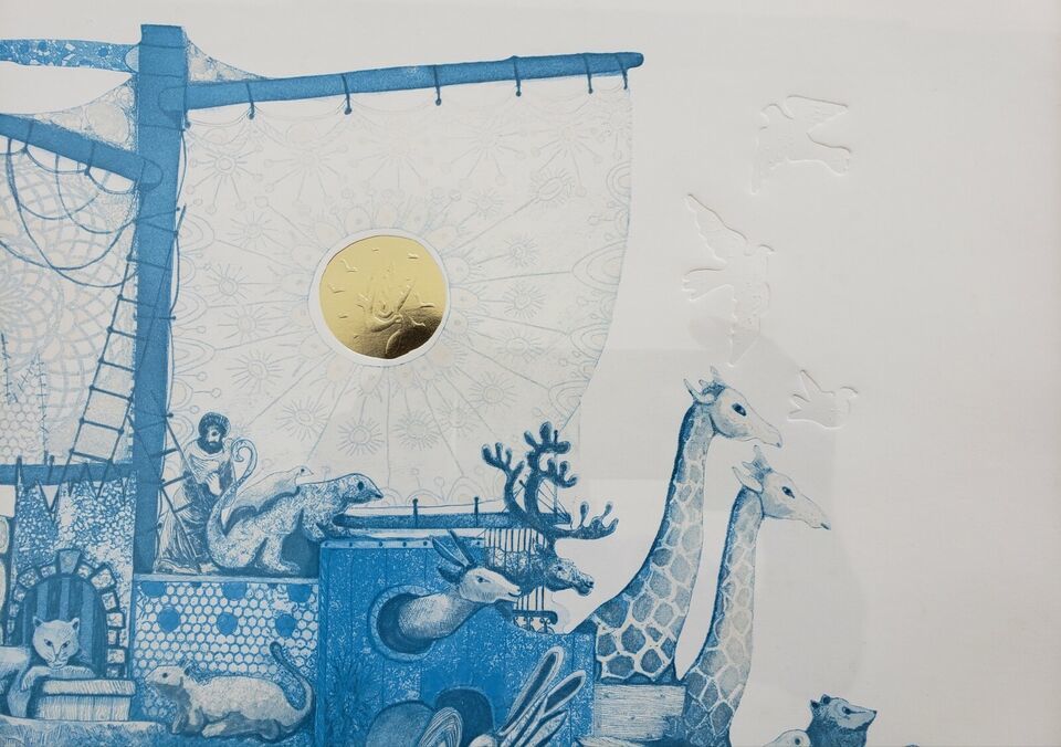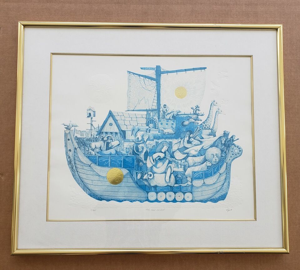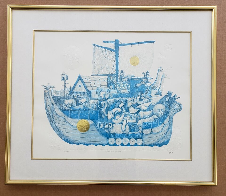 Signed Amram Ebgi "Noah and the Ark" Blue Color Embossed Gold Etching Art Print
