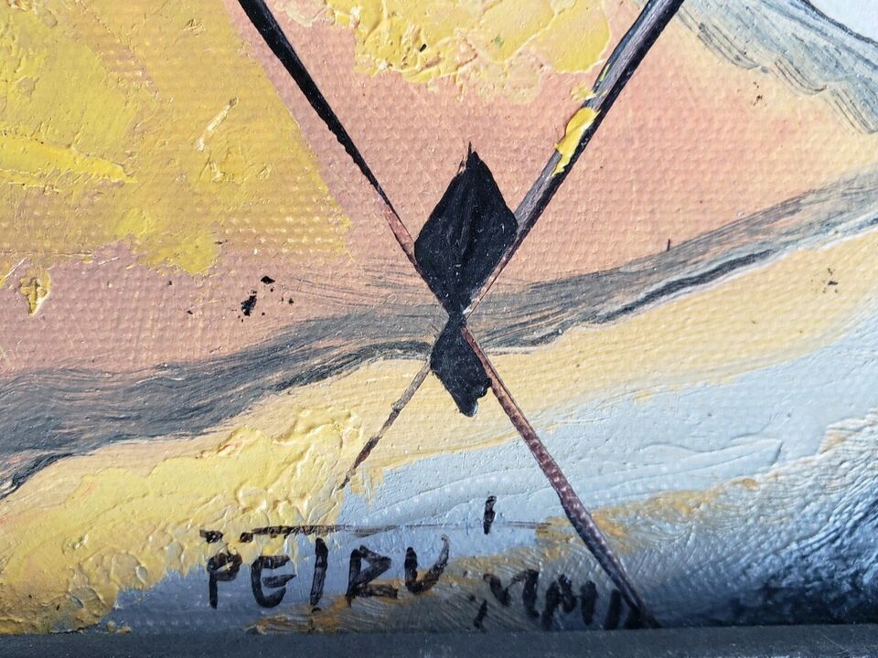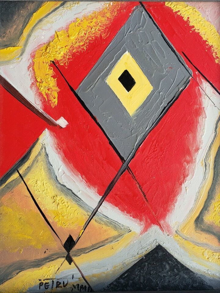 Rare Signed Petru Abstract Geometrical Acrylic Art Colorful Painting on Canvas