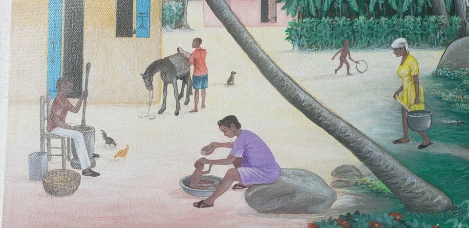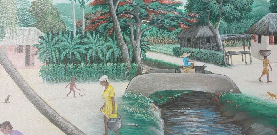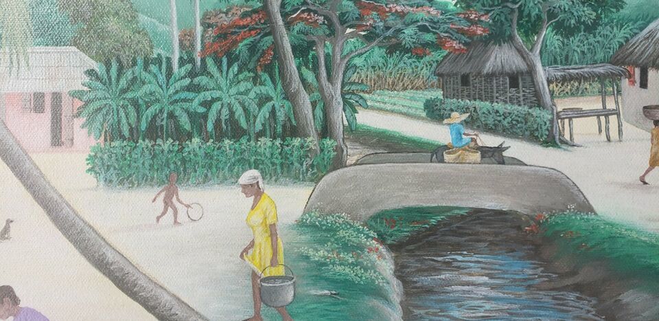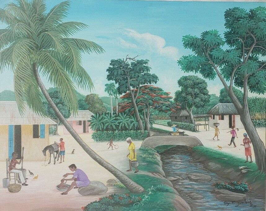 Rare Signed 2002 Guy F. Joachim Haitian Landscape painting highlighting daily life routine in the countryside of Haiti. Painting is bright and vivid with great detail.