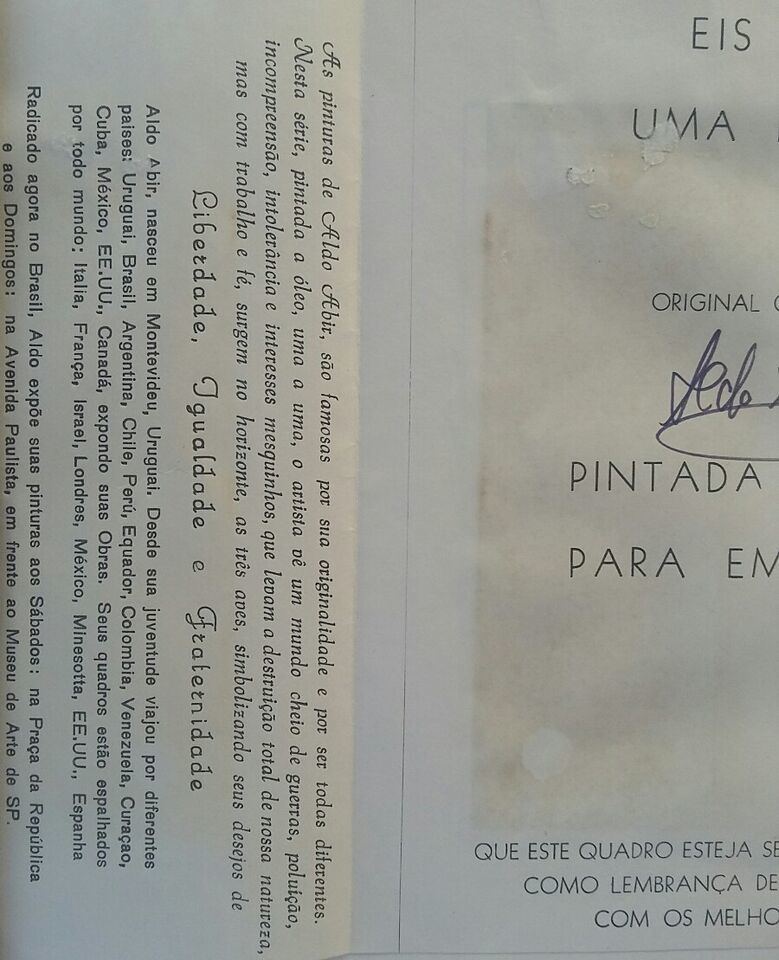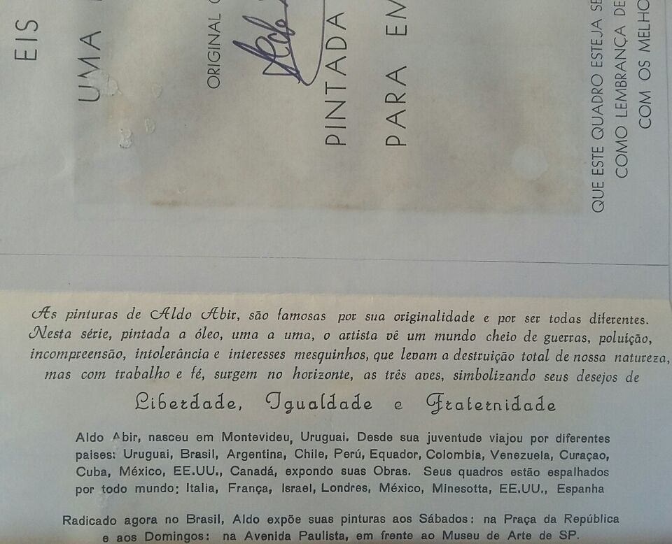 Esmeraldo Abir Falk, a plastic artist, known as Aldo Abir, was born in Montevideo, Uruguay, on April 8, 1931 and died on April 21, 2003. Since he was a child, he showed an interest in different designs and things. On April 8, 1973, the day of his birthday, he heard on the radio about the death of Pablo Picasso, at this moment he was overwhelmed by the urge to paint. When selling two of the first works, he decided to take painting classes with the best painter in Uruguay. In showing some of his works to artists such as Sartbout, Vernazza, Curto, Catelani, Di Segni, Studer, Tejera, Paez Vilaro, almost all were unanimous: "Artist is born and painter is made". The artist is free to follow his own technique and his own way. The painter learns a technique and continues painting the same. Just as he learned English by watching American films since he was 3 years old, he decided to learn by buying the catalogs and observing paintings by various artists. It began with abstracts and presented to all of us with works in different techniques, however, always stood out for his love to the nature that he knew through trips by several Countries.