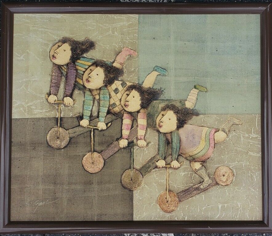 Rare Vintage Signed J. Roybal - 4 Girl's Riding on Scooters - Children Playing Art Series Painting on Canvas. Framed on canvas. Frames measures 20 by 24" inches. Painting is in excellent condition as described in the photo gallery. Shipped with FedEx Ground or FedEx Home Delivery.