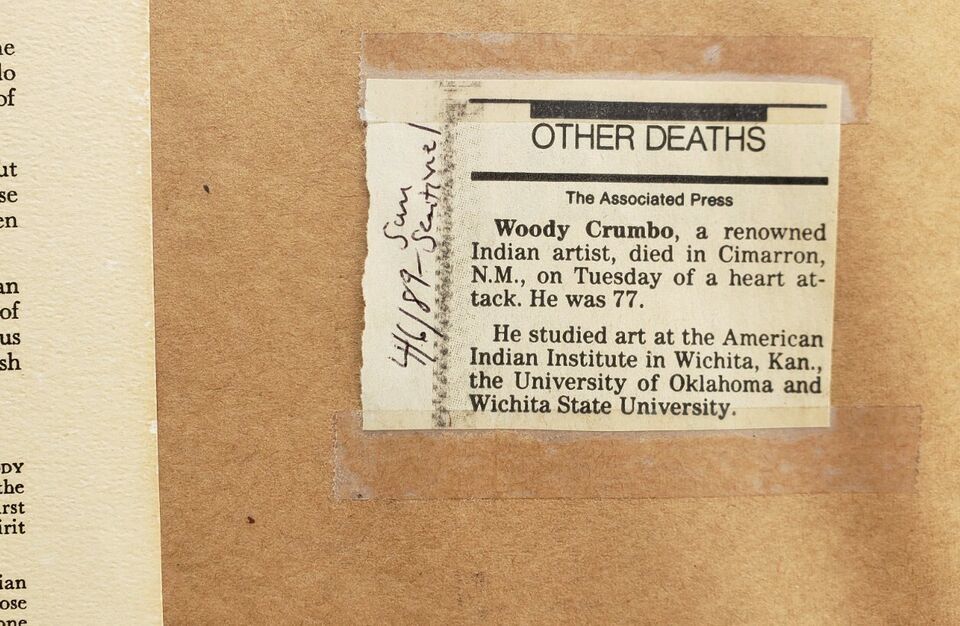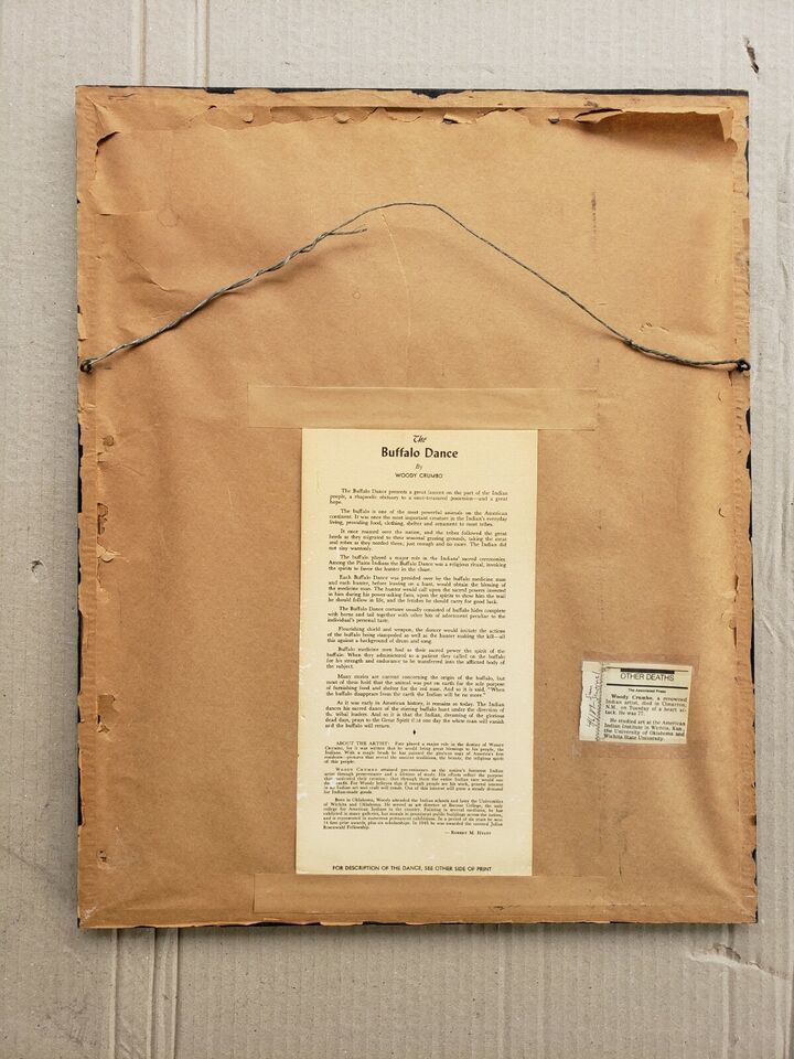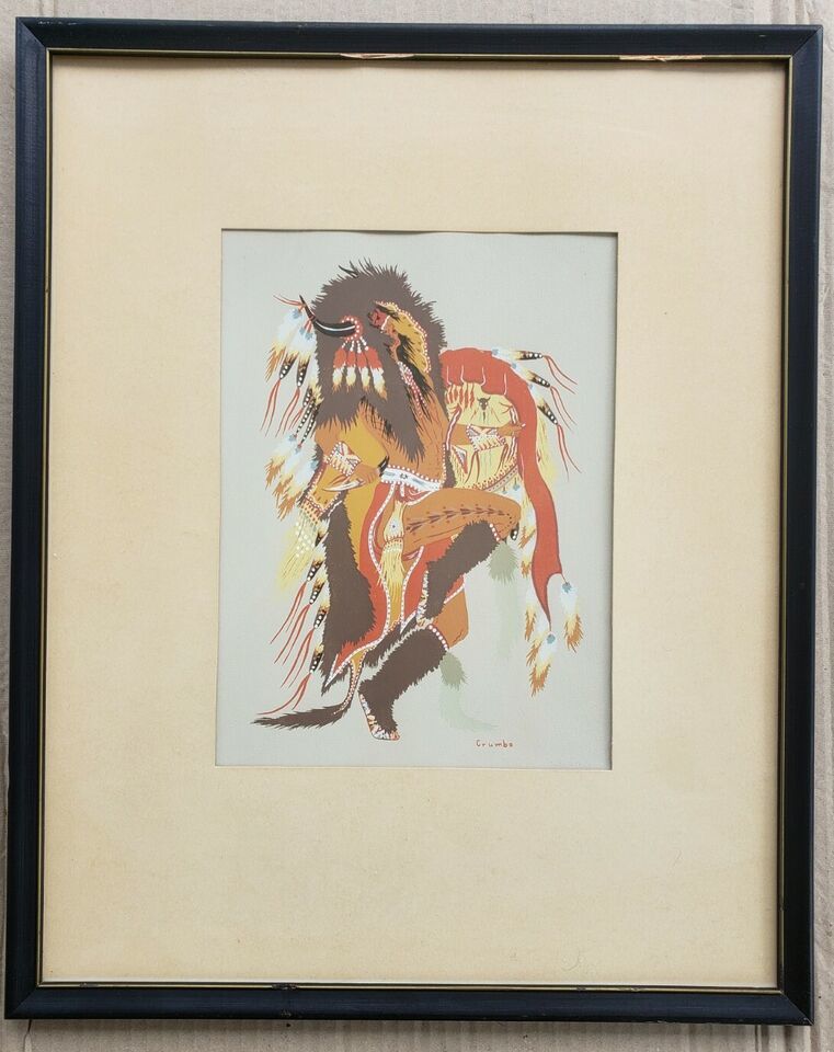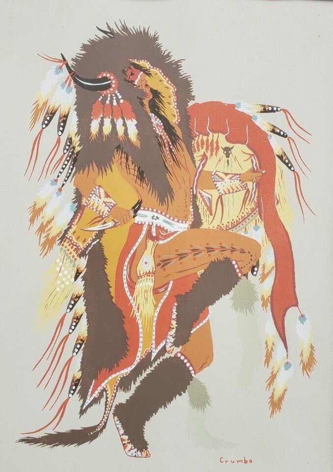 This is a Woody Crumbo (1912-1989) silk screen feather dancer art print. The silk screen is in good condition as displayed in the photo gallery. It is sealed in it original frame it comes with nice heavy double matting . It will also include the backing board which has some information about The Buffalo Dance. Frame measure 20 by 28 inches. About the Artist: ?Woody? Crumbo was born Woodrow Wilson Crumbo on January 21, 1912 in Lexington, Oklahoma. His background spans several tribes of Indians. He was born of the Potawatomi Tribe and lived with a Creek family as a boy. His early schooling was at a Government Indian School in Chilocco, Oklahoma. Crumbo was widely known for his etching, silk screens and paintings. He is represented by six large murals in the new Department of Interior Building, Washington, DC., about 175 paintings in the Gilcrease Museum's permanent collection, Tulsa, Oklahoma and in other public building as well as many museums and private collections throughout the United States. In a period of six years he won 14 first place awards plus six scholarships. In 1945 he was awarded the coveted Julius Roswenwald fellowship.