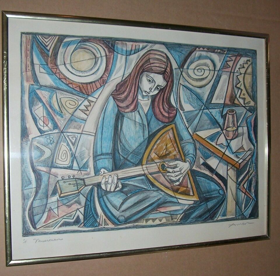 Original Hand Signed Irving Amen "Musician" Judaica A/P Lithograph Print Israel