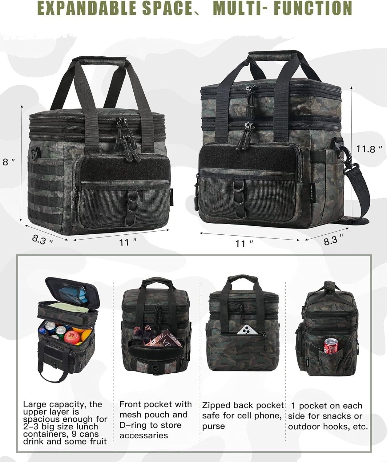 ?Large Capacity Multi-Function?JOYHILL large adult lunch box sized in 8.3" x 11" x 11.8" (L*W*H) ,18L capacity with an easy accessible wide opening. 5L upper layer for a big lunch box or snacks; 13L bottom layer is roomy for 2-3 large size lunch boxes, 9 cans of drinks and some fruits. 4 outer multi-function pockets are for tissue, cutlery, phones or small items. Expandable design can save space when not in use. Various colors add options for outdoor work, camping, picnic, beach, etc.
