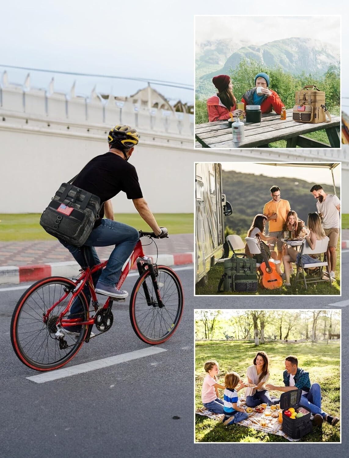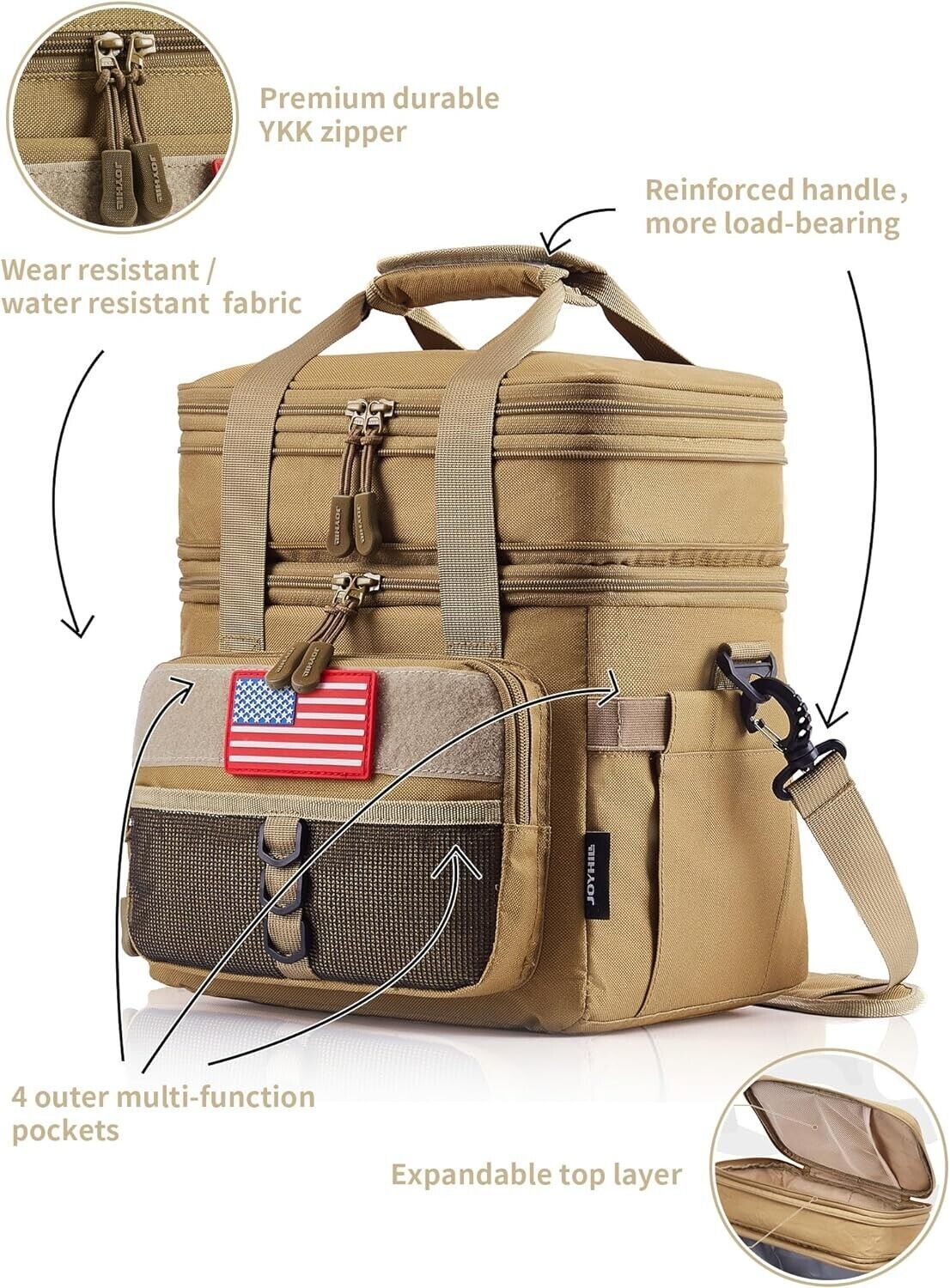 ?Excellent Design?This insulated cooler bag is designed with a mixture of outdoor and tactical elements, very tough. This tactical lunch box can be a messenger bag or a handbag, coming with adjustable shoulder strap and wider shoulder pad for reducing load-bearing. The front pocket has a velcro for affixing national flags or warning tips. Meet requirements of outdoor lovers and military fans for lunch box cooler, add more fun for your lunch.