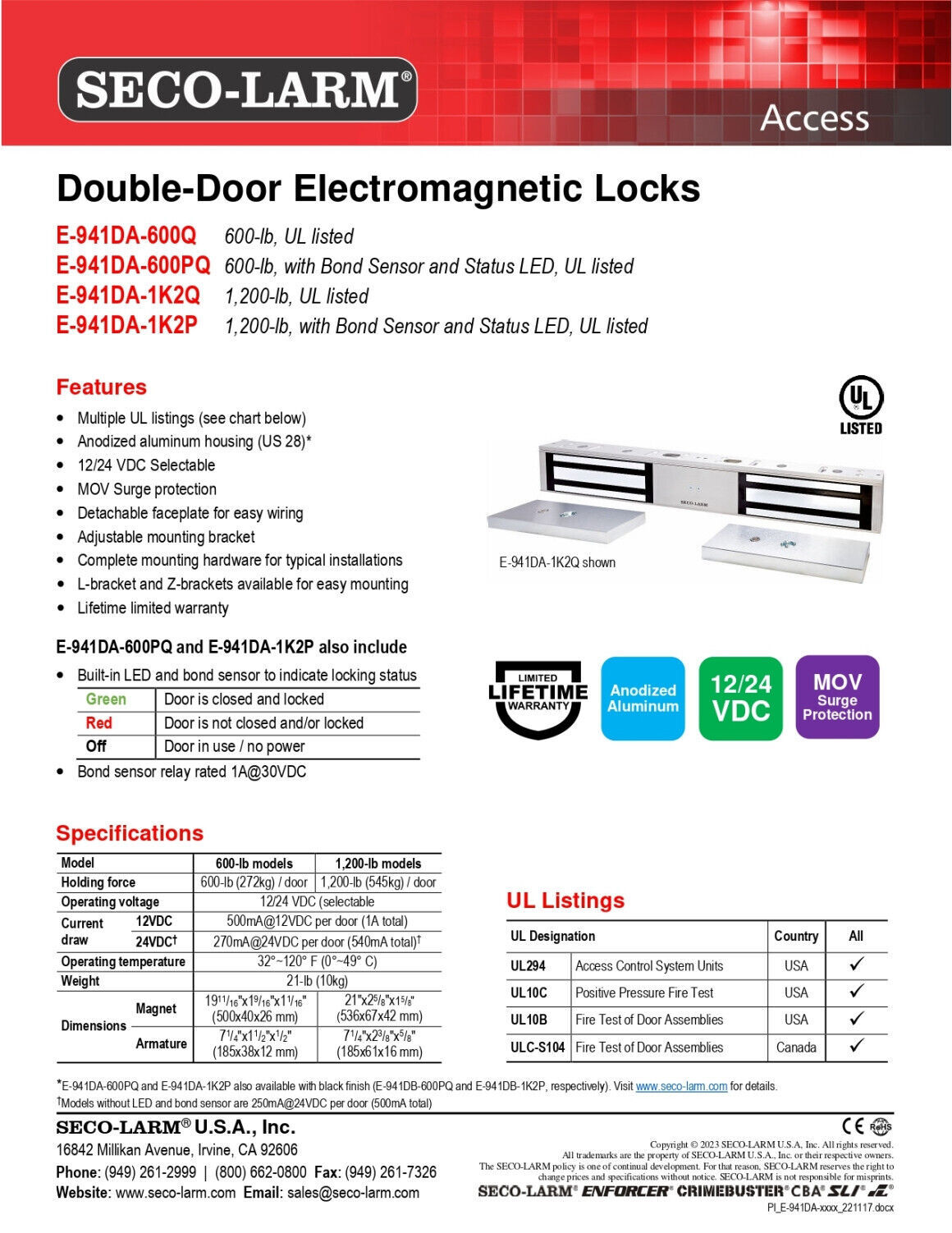 Seco-Larm E-941DA-600Q Double-Door Electromagnetic Lock, 600-lb (272kg) Holding Force per Door, No Residual Magnetism, MOV Surge Protection, Anodized Aluminum Housing (US 28), Adjustable Mounting Bracket, Detachable Face Plate for Easy Access to Wiring, Complete Mounting Hardware for Typical Installations, 12 or 24 VDC Selectable
