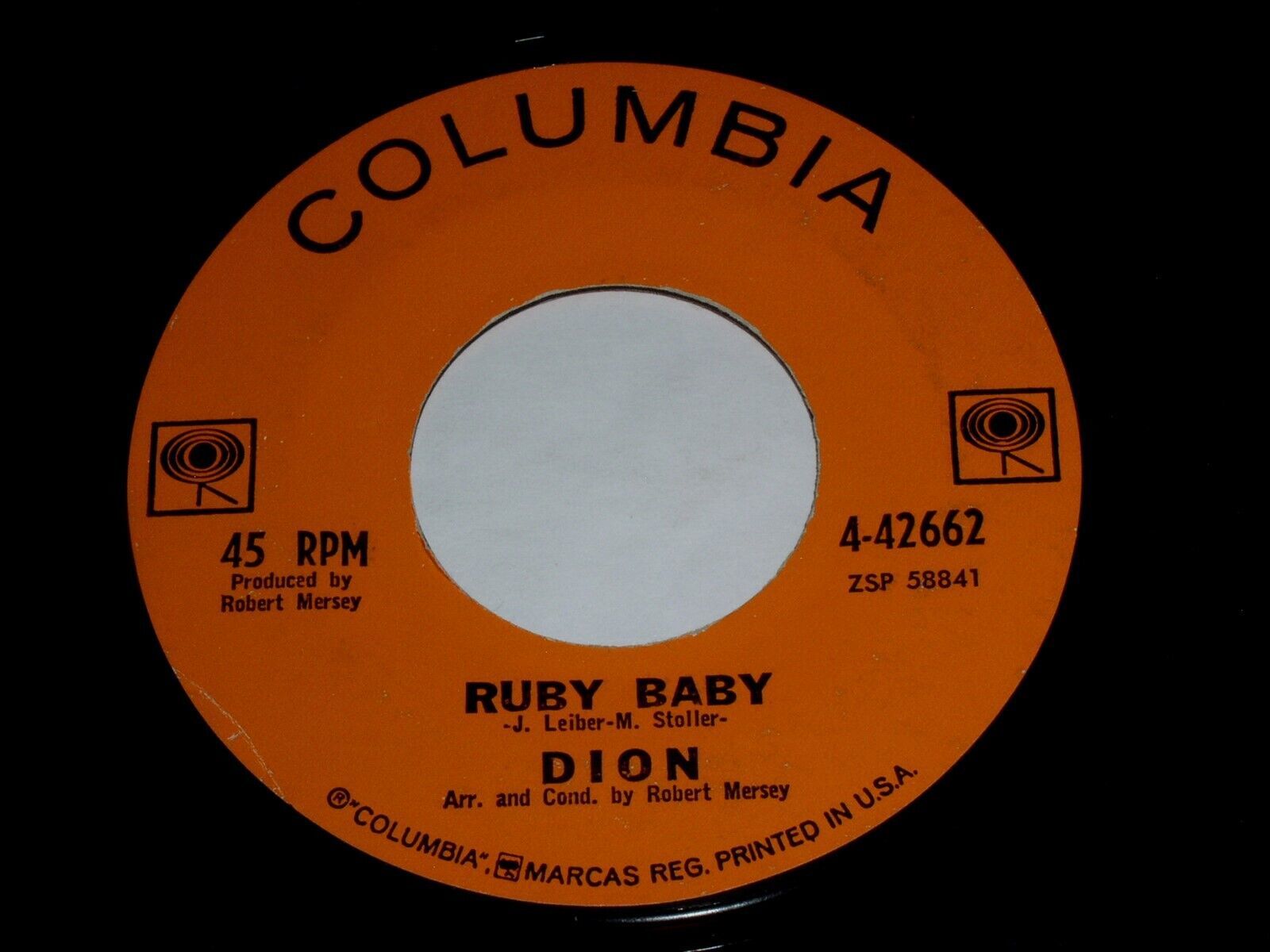 This is a vintage 45 rpm phonograph record by Dion, entitled, "Ruby Baby". Flipside: "He'll Only Hurt You". Record label: Columbia 4-42662.
